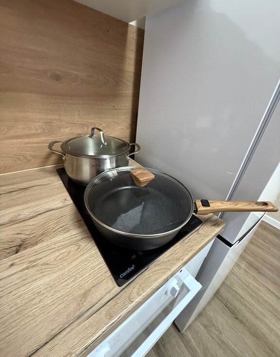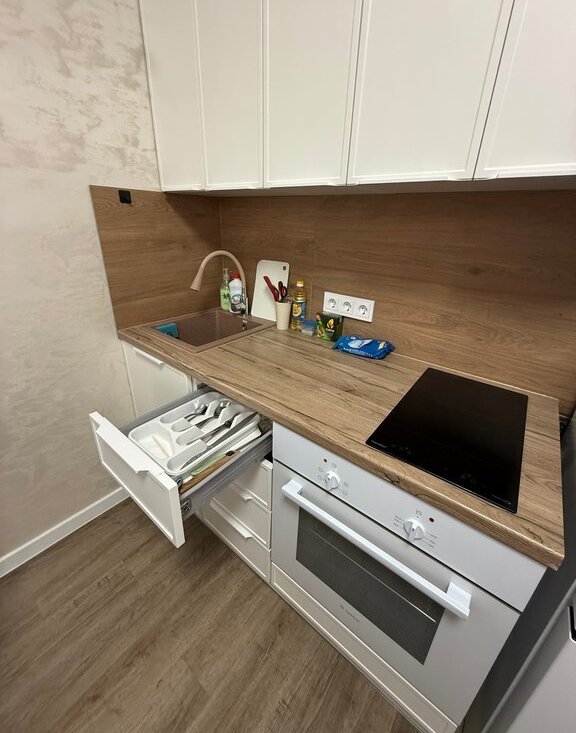 🍽 Уютная кухня: большой обеденный стол, мягкий диван и два стула с мягкими спинками, техника (индукционная инверторная варочная поверхность для быстрого и безопасного приготовления, встроенный духовой шкаф, СВЧ, холодильник, электрочайник) и вся посуда для приготовления и приема еды.