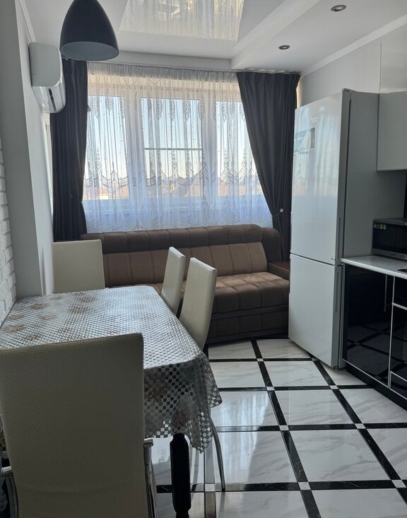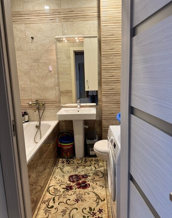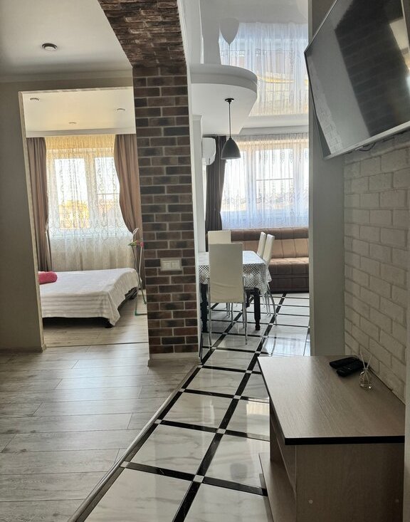 В квартире сделан качественный евроремонт. В комнатах и на кухне есть вся необходимая мебель, чтобы вы могли сразу почувствовать себя как дома. Из техники в вашем распоряжении: кондиционер, холодильник, телевизор и стиральная машина, духовой шкаф, электрическая плита. Санузел совмещенный, оборудован современной ванной, где можно расслабиться после долгого дня.