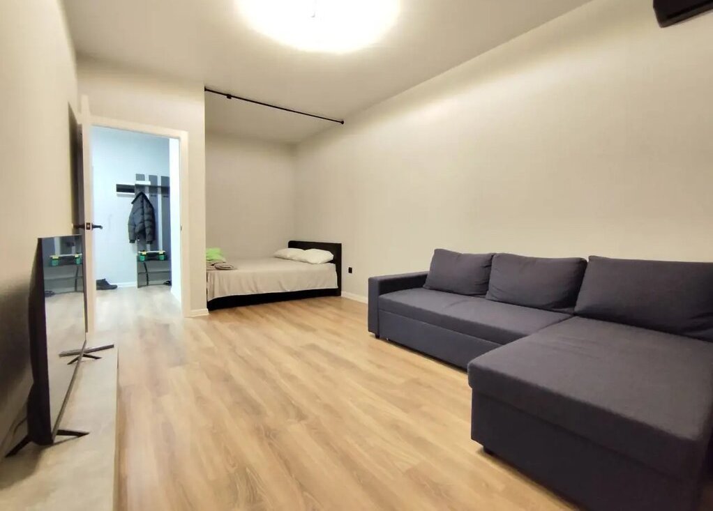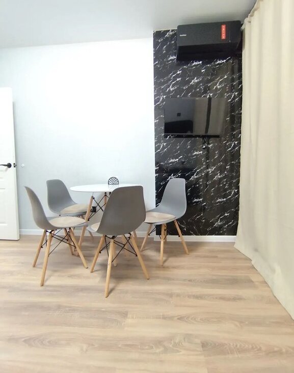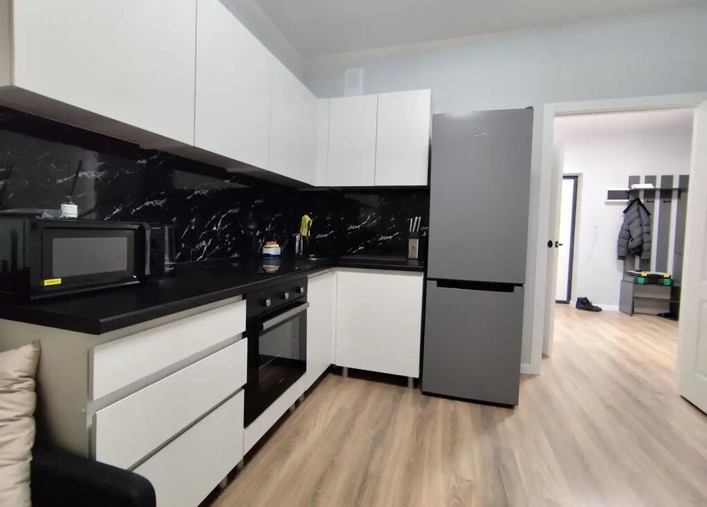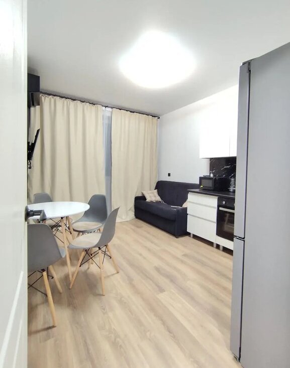 Полностью обopудована: Кондиционер, Телевизор Смарт с голосовым помощником, двухкамерный холодильник, плита, духовой шкаф, микроволновая печь, чайник, диван раскладной, стол co cтульями нa 4 человека.