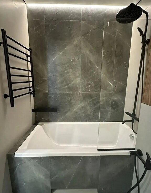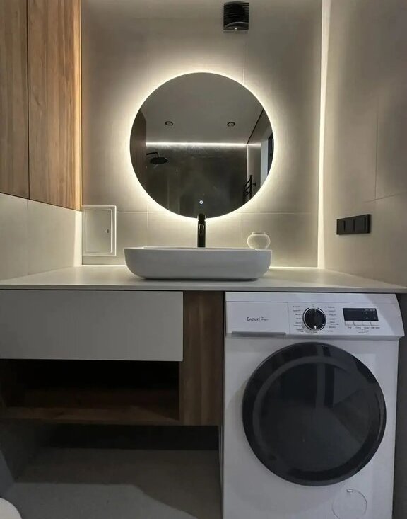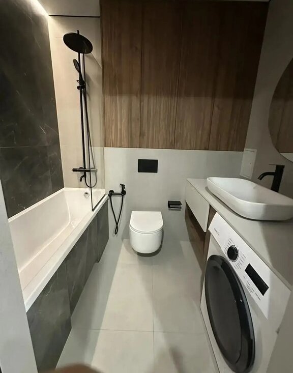 Квартира оснащена теплыми полами, что обеспечивает дополнительный комфорт. В совмещенном санузле установлена стильная сантехника и современная стиральная машина. Отдельная большая гардеробная.