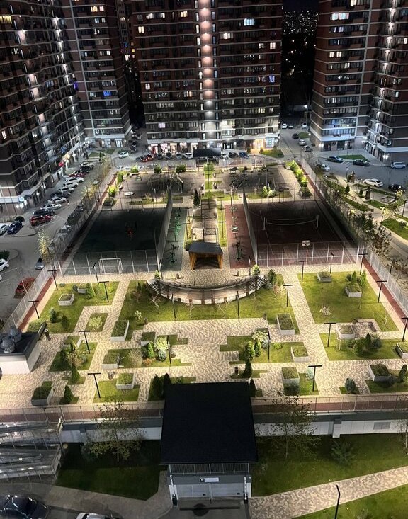 На территории дома: детская площадка, спортивные площадки, спортивные тренажеры, зоны отдыха, амфитеатр, фонтан.