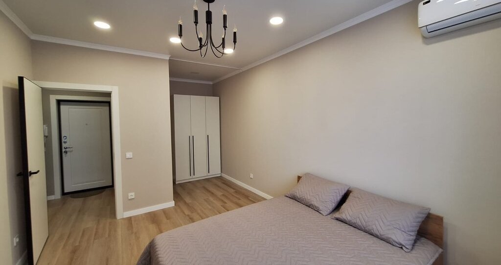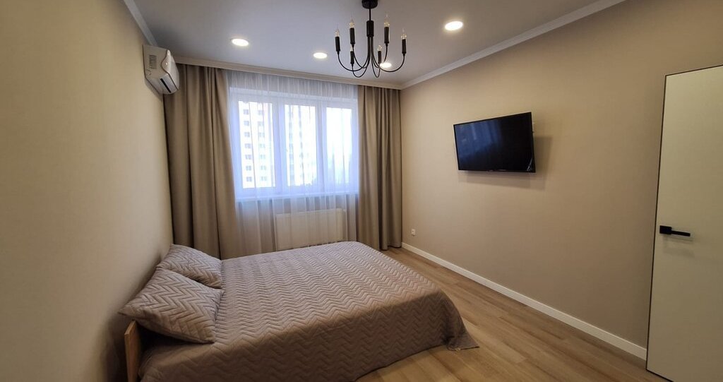 Гостиная: Смарт-ТВ, кондиционер, кровать с ортопедическим матрасом, шкаф, прикроватные тумбы, стильные шторы.