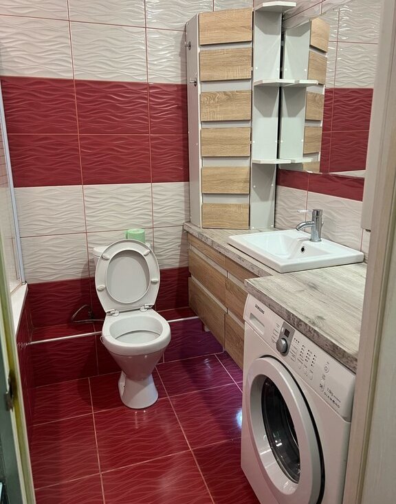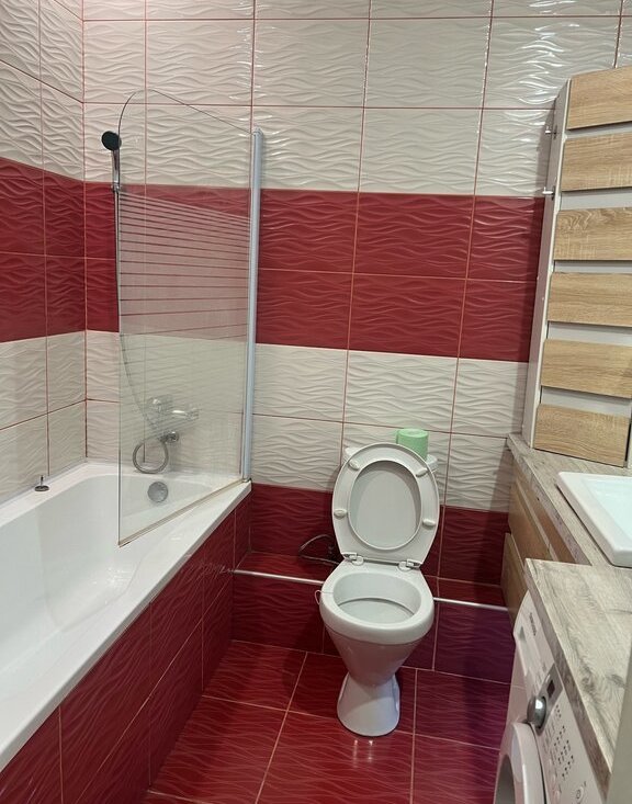 Санузел отделан плиткой.Ванная с тропическим душем.Стеклянная шторка.Также есть электрический полотенцесушитель. Встроенная Bluetooth- музыка при включении света, подсветка по полу и зеркалу работающая по датчику движения.