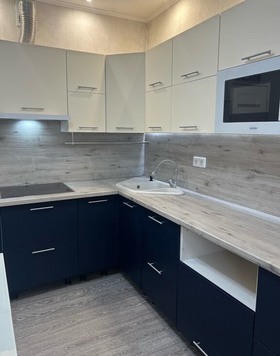 встроенная микроволновка,индукционная плита,холодильник,чайник, посуда(духовка обговаривается по необходимости)Есть стол раздвижной и угловой диван раскладной, который можно использовать как доп спальное место.