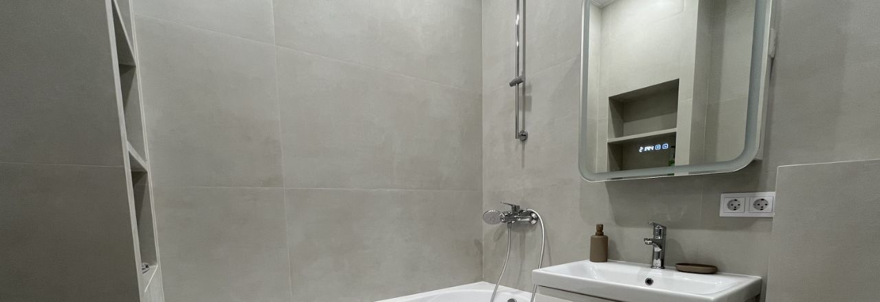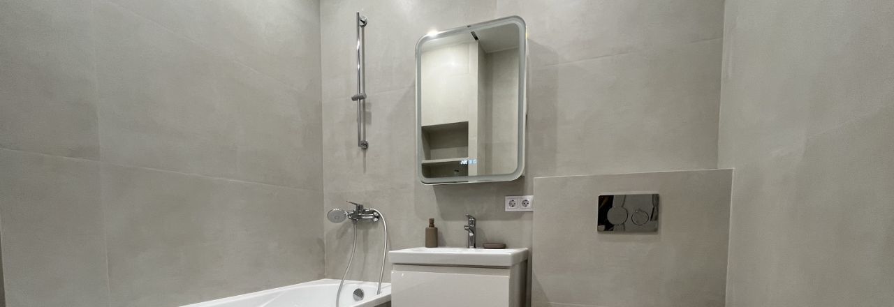 * Ванная комната: керамогранит, инсталляция, умывальник, зеркало