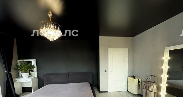 Просторная спальня с дизайнерской люстрой и черной акцентной стеной;