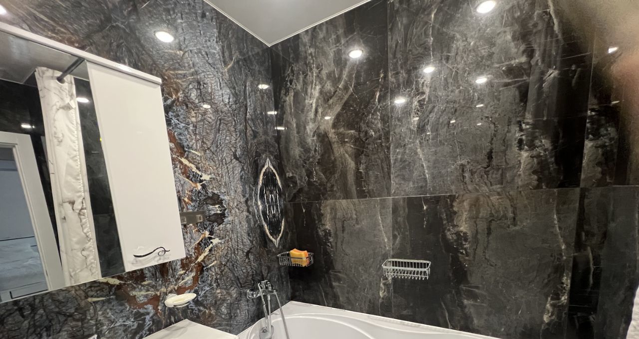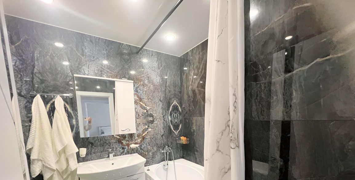 Санузлы раздельные, оформлены в стильном мраморном стиле. В спальне есть балкон, где можно наслаждаться свежим воздухом, второй балкон на кухне совмещен с кухней.