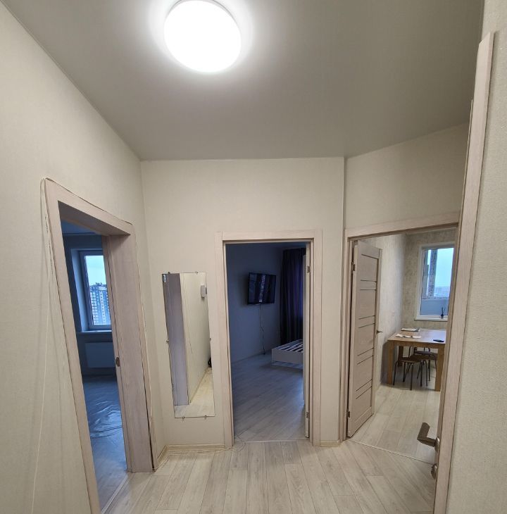 Сдается уютная 2-комнатная квартира с евроремонтом. Общая площадь — 53.1 кв.м, жилая — 30 кв.м, кухня — 16 кв.м. Квартира находится на 17 этаже 25-этажного кирпичного дома, построенного в 2021 году. Высота потолков составляет 2.7 метра.