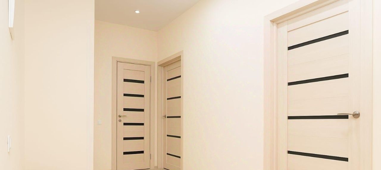 На полу положен влагостойкий ламинат класс 32, обои, вывод под кондиционер. Высота до натяжных потолков 2, 65 м.