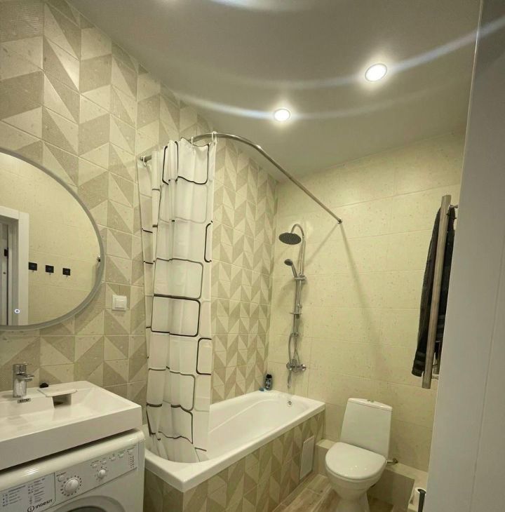 В ванной комнате установлена современная сантехника, включая стиральную машину. Раздельный санузел добавляет удобства в повседневной жизни.