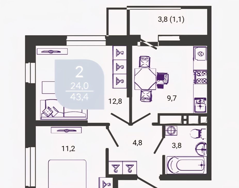 2-к кв. Краснодарский край, Краснодар ул. Имени Героя Георгия Бочарникова, 2 (43.0 м²)