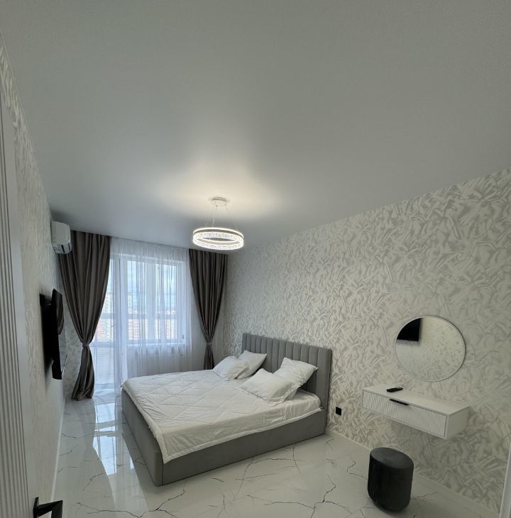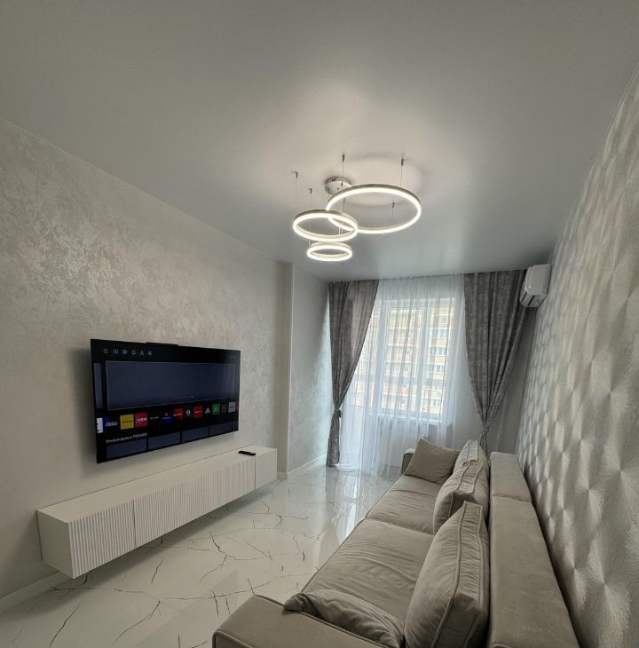 Квартира с дизайнерским ремонтом, полностью готова к комфортному проживанию. В наличии вся необходимая техника: кондиционер, холодильник, телевизор и стиральная машина. Мебель располагается на кухне и в комнате. Планировка включает одну ванную комнату с ванной и отдельный санузел. Дополнительно есть одна лоджия и три балкона для вашего отдыха на свежем воздухе.