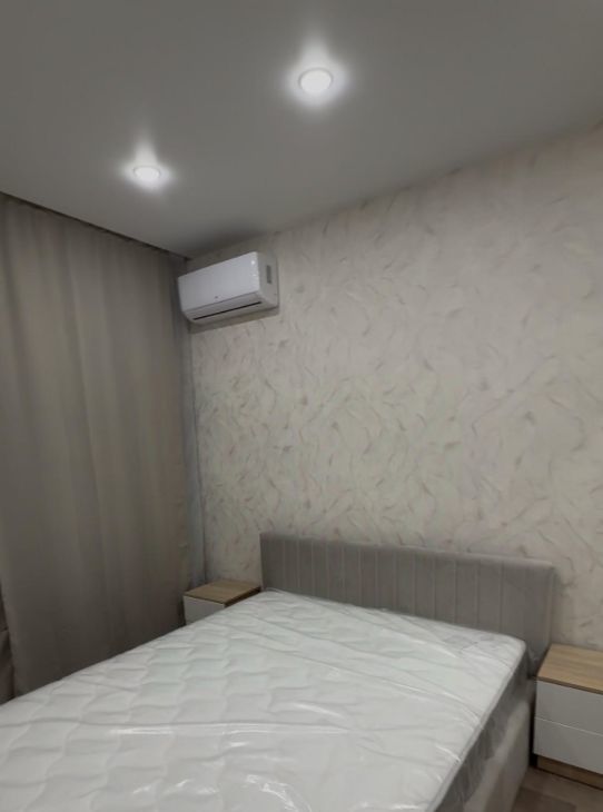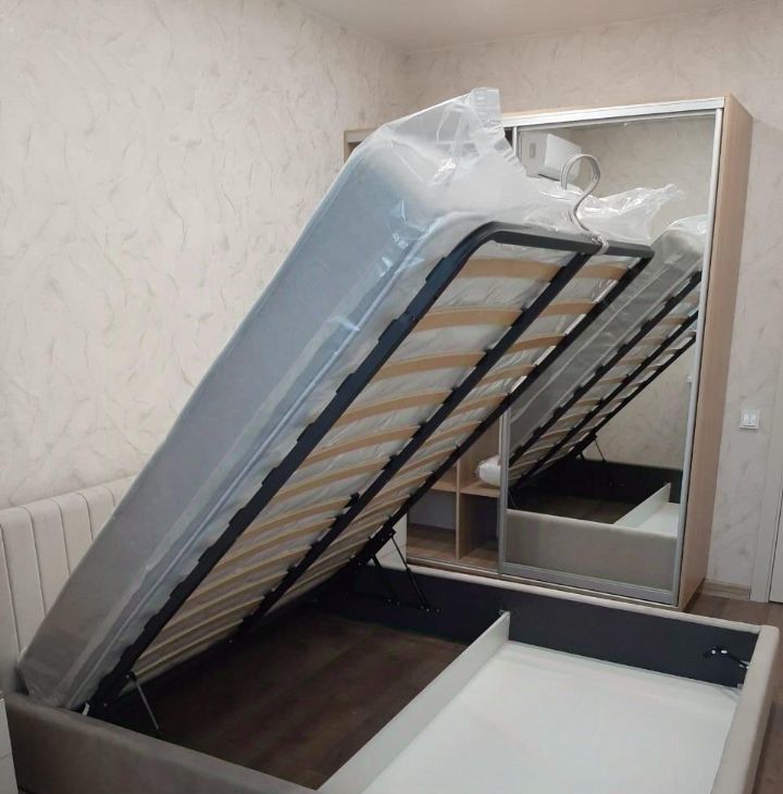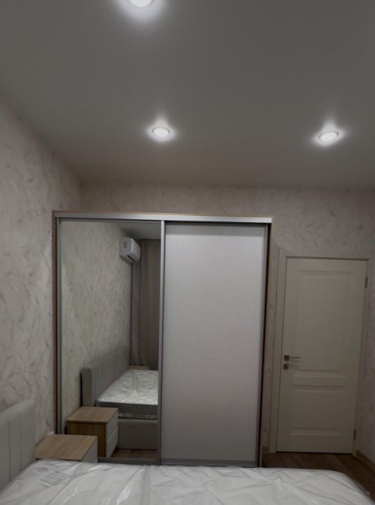 - В спальне: двуспальная кровать с ортопедическим матрасом и дополнительным местом для хранения, шкаф-купе для одежды, прикроватные тумбы + кондиционер
