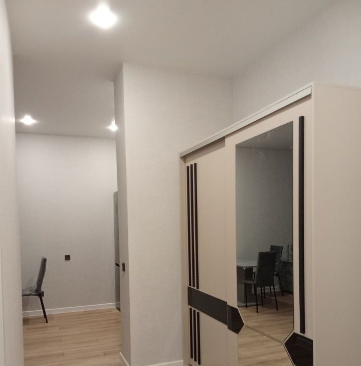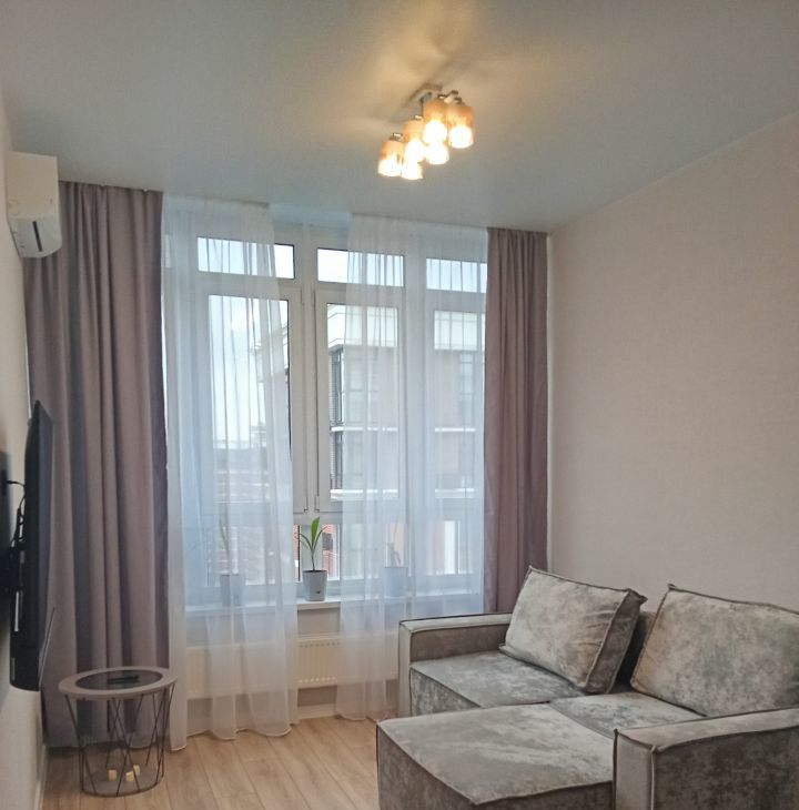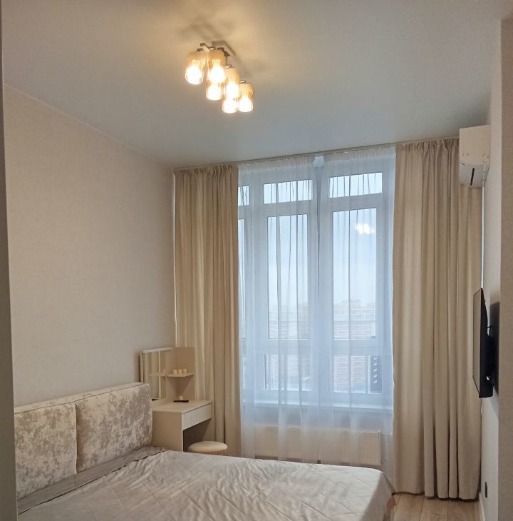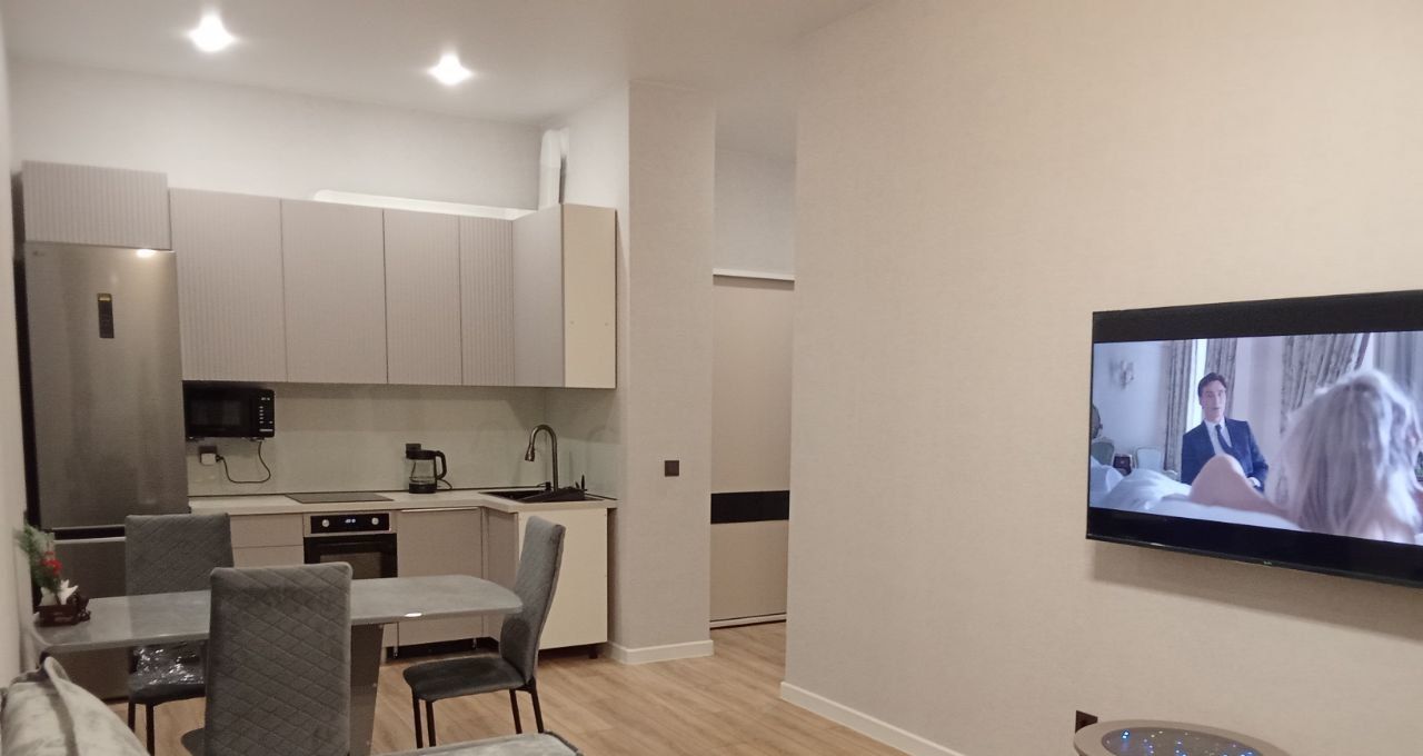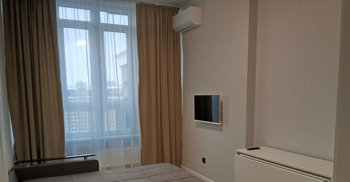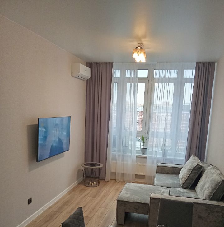 В квартире есть всё необходимое для комфортного проживания: стильная мебель в комнате, современная техника — кондиционер, холодильник, телевизор, посудомоечная и стиральная машины. Ванная комната оборудована удобной ванной. Все элементы интерьера тщательно подобраны, чтобы создать атмосферу уюта и гармонии.