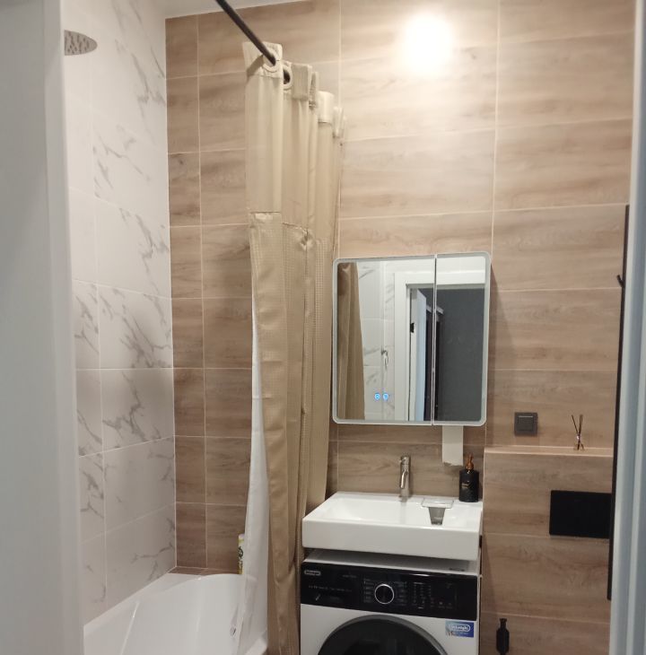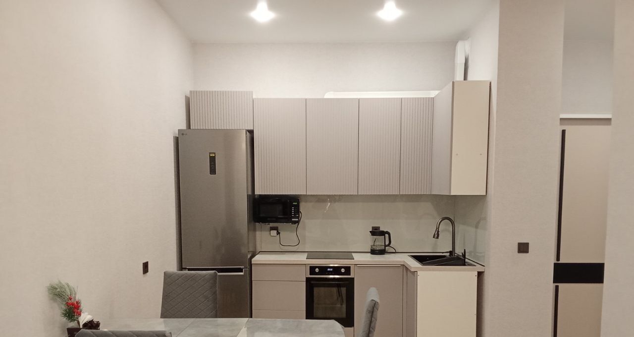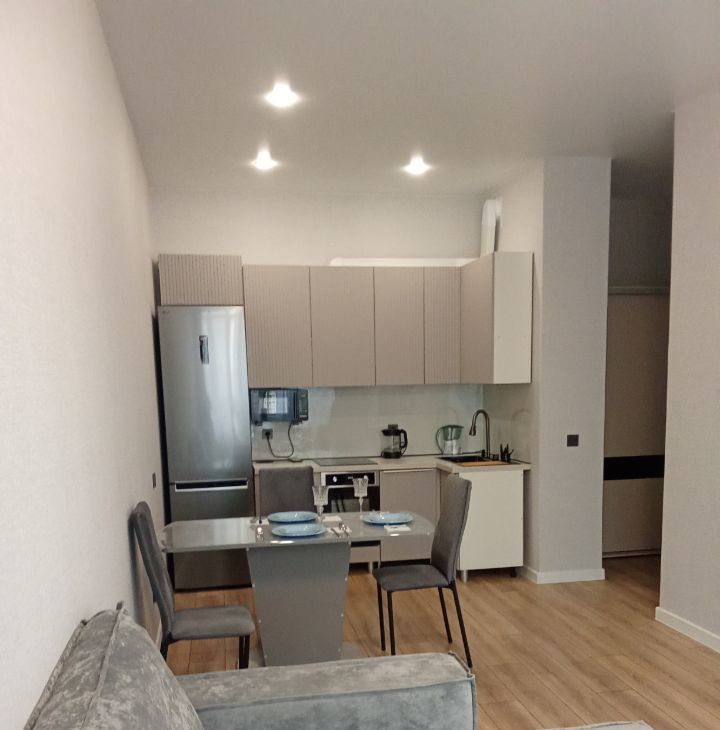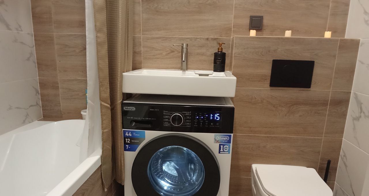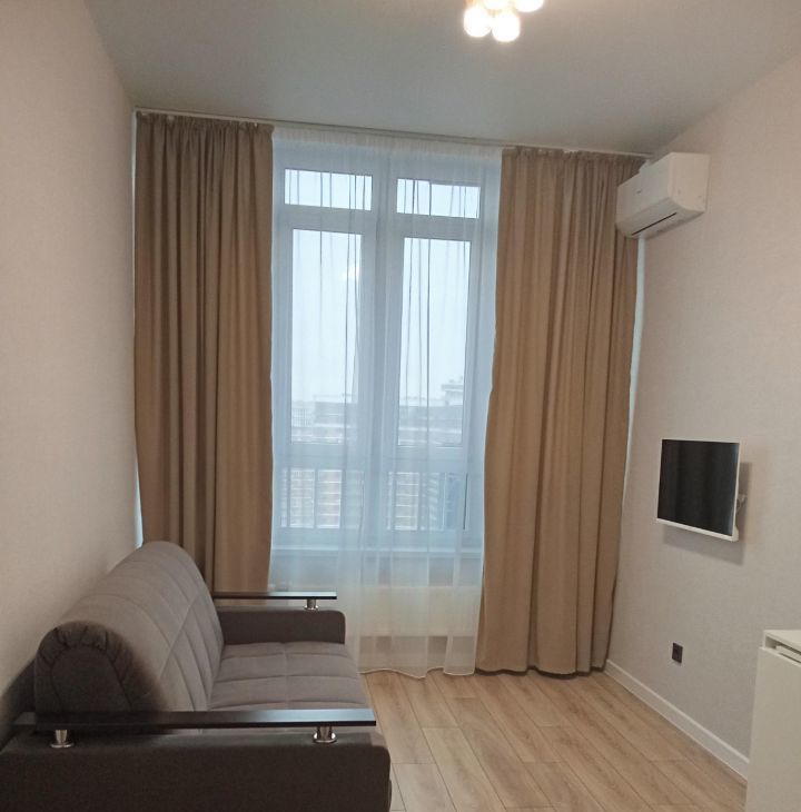 В квартире есть всё необходимое для комфортного проживания: стильная мебель в комнате, современная техника — кондиционер, холодильник, телевизор, посудомоечная и стиральная машины. Ванная комната оборудована удобной ванной. Все элементы интерьера тщательно подобраны, чтобы создать атмосферу уюта и гармонии.