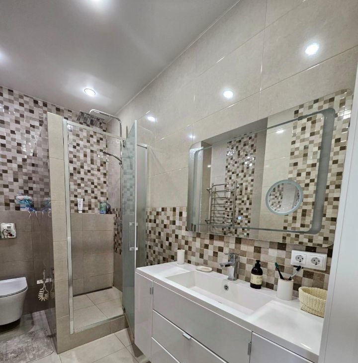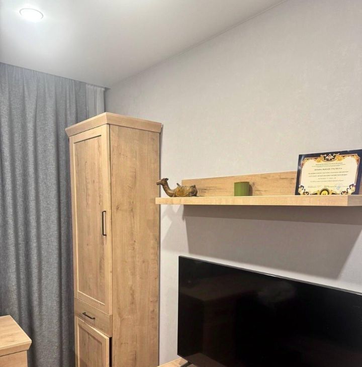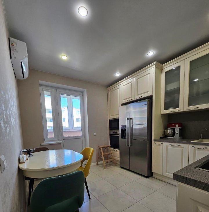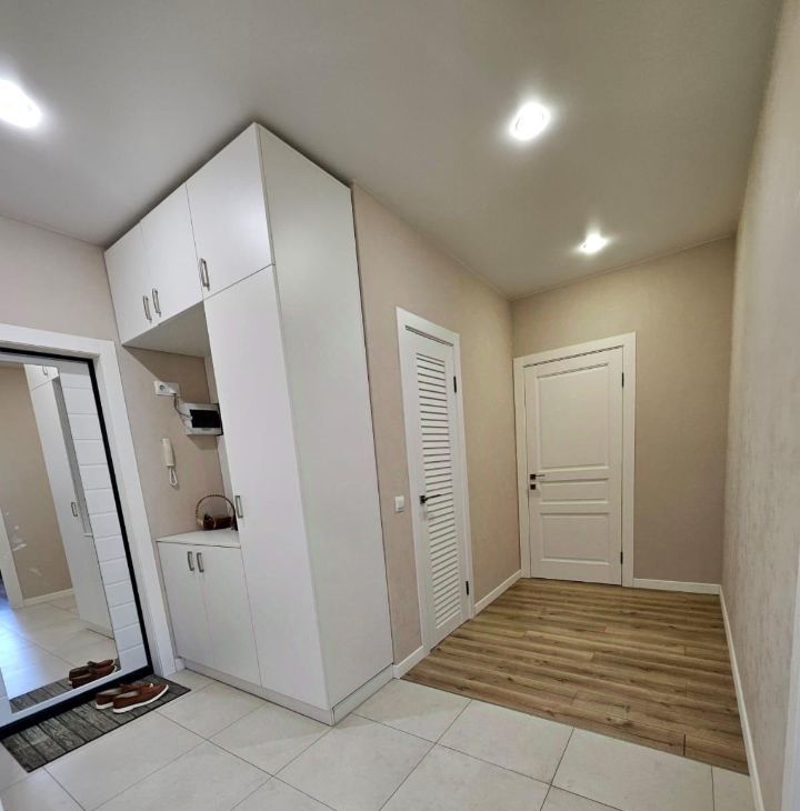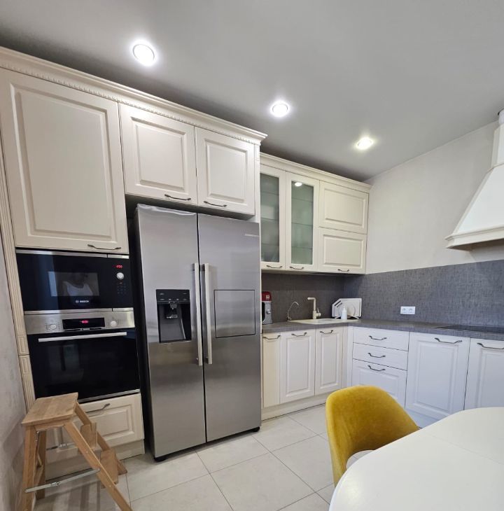 Кухонный гарнитур Мария, вся бытовая техника Bosch (варочная панель, духовой шкаф, встроенная микроволновая печь, холодильник side-by-side с лёдогенератором, стиральная машина), вытяжка в стиле кухонного гарнитура с деревянной отделкой. В кухне установлена система очистки воды. В спальне установлены встроенный зеркальный шкаф и туалетный столик Мария.