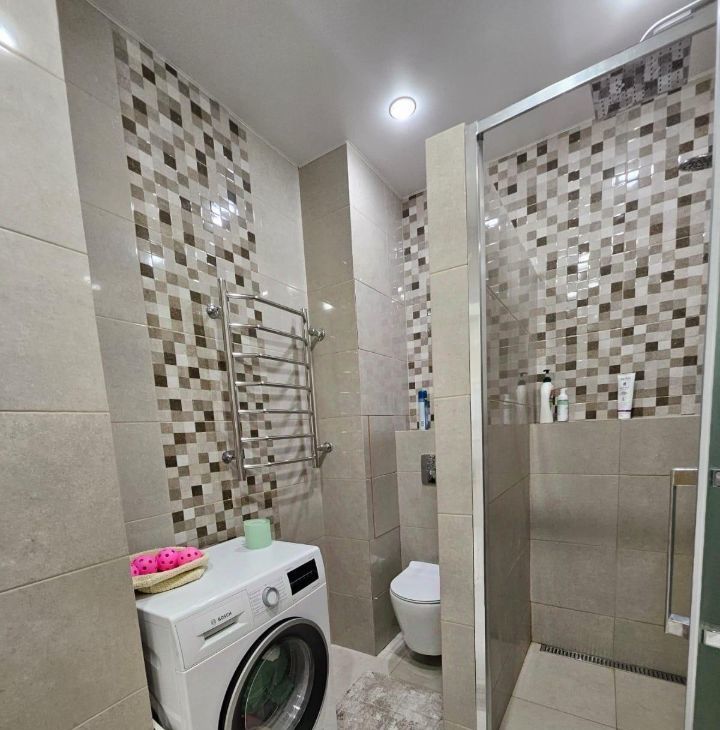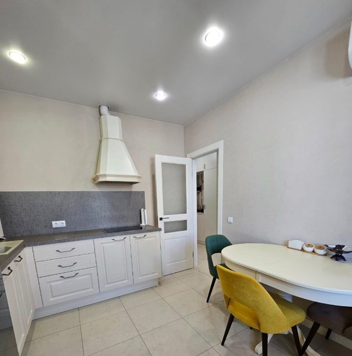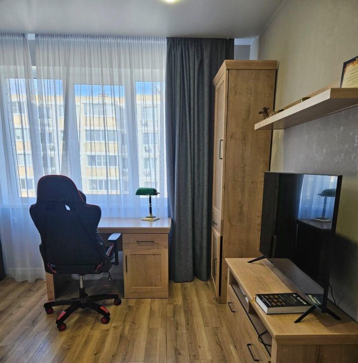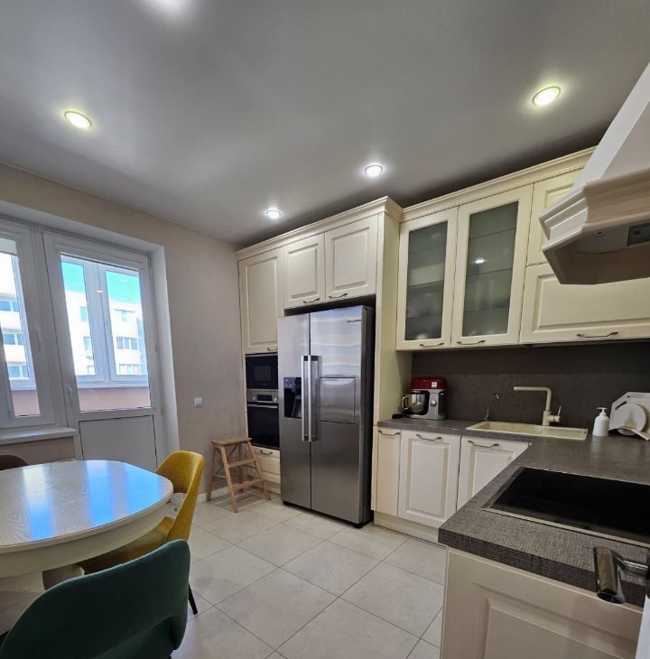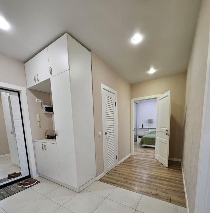 Кухонный гарнитур Мария, вся бытовая техника Bosch (варочная панель, духовой шкаф, встроенная микроволновая печь, холодильник side-by-side с лёдогенератором, стиральная машина), вытяжка в стиле кухонного гарнитура с деревянной отделкой. В кухне установлена система очистки воды. В спальне установлены встроенный зеркальный шкаф и туалетный столик Мария.