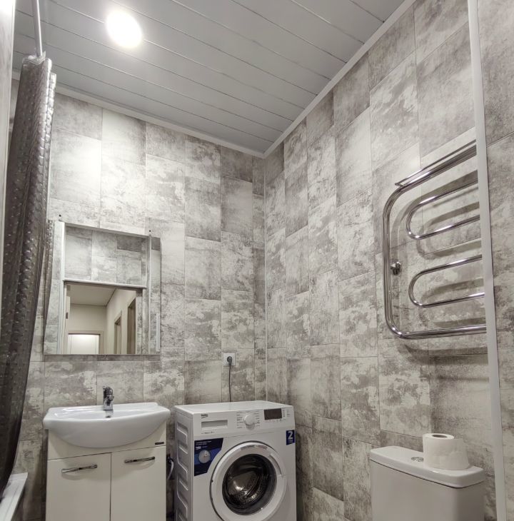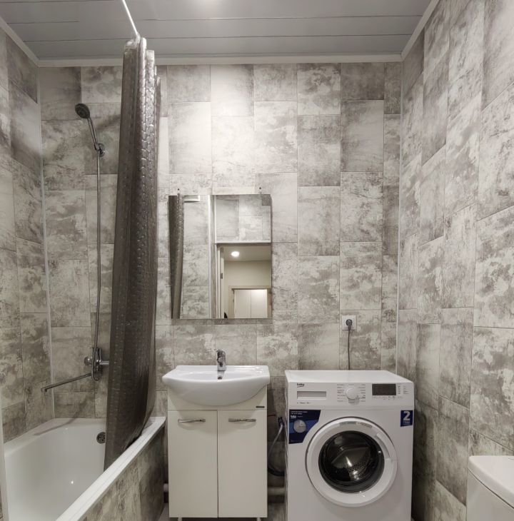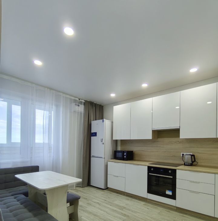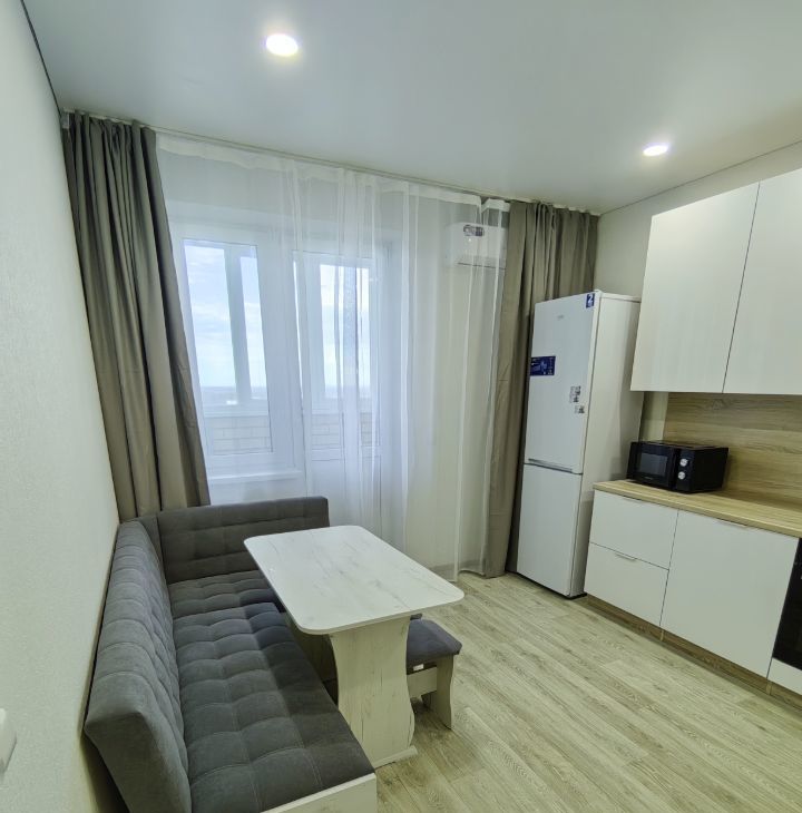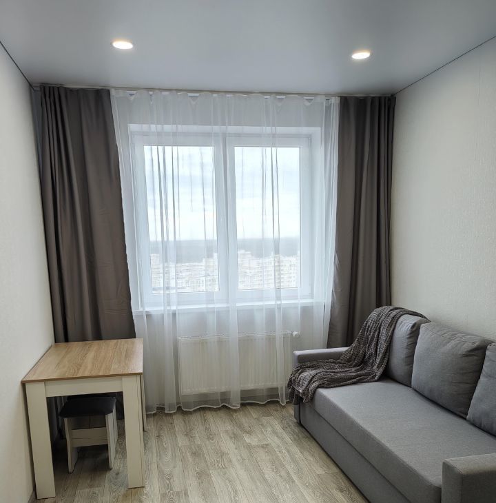 Хороший ремонт, есть вся необходимая мебель и техника (в том числе микроволновка, пылесос, утюг, гладильная доска, сушилка для белья). Квартира теплая, с удачным расположением окон - с видом на город, парковку, детский сад, школу, вечером - на закат.