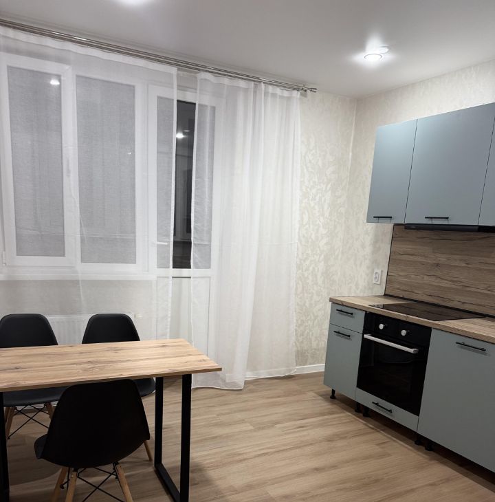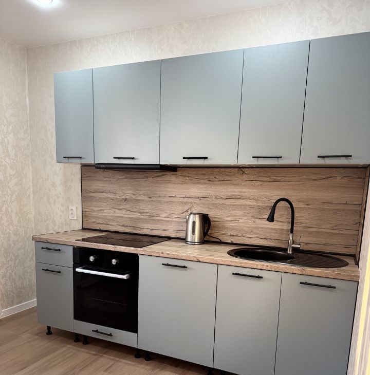 Отдельная кухня со всей необходимой новой бытовой техникой (плита, холодильник ( на фото его нет, но он уже в пути)), вытяжка.