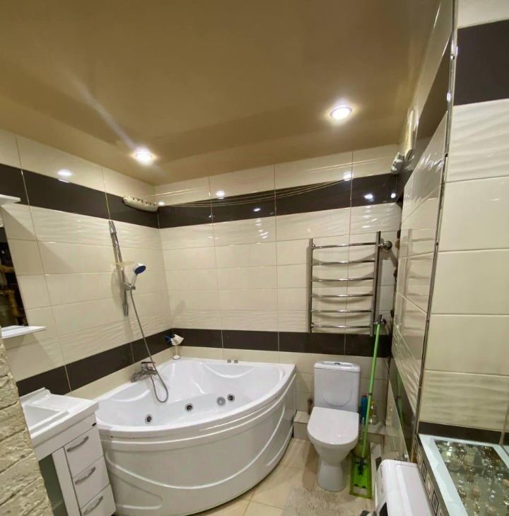 Санузел совмещенный, выполнен в современном стиле с качественной отделкой.