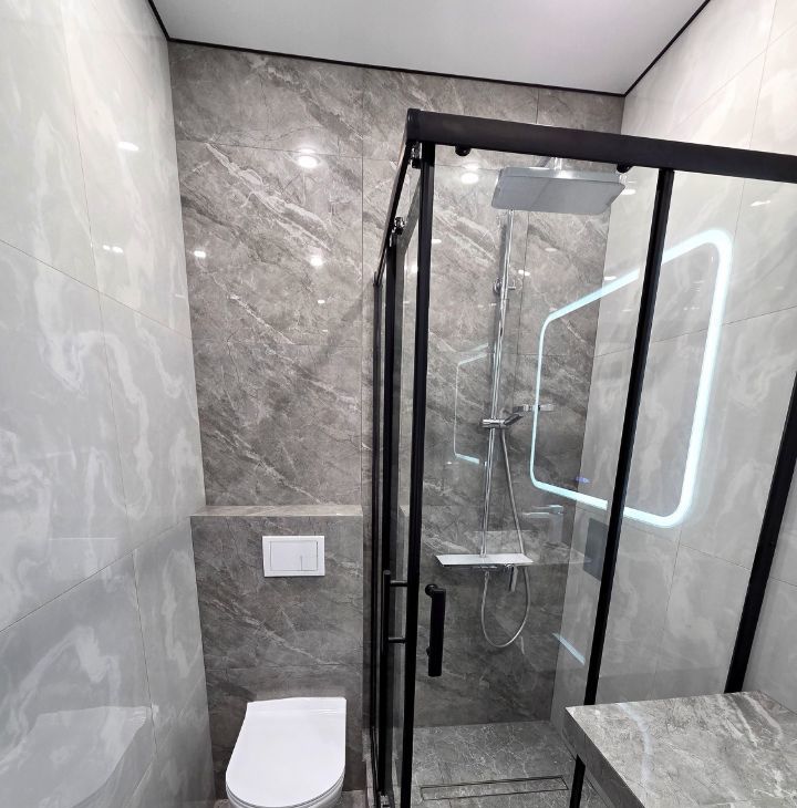 Полы: Влагостойкий ламинат Egger (34 класс). В санузле — индийский керамогранит.