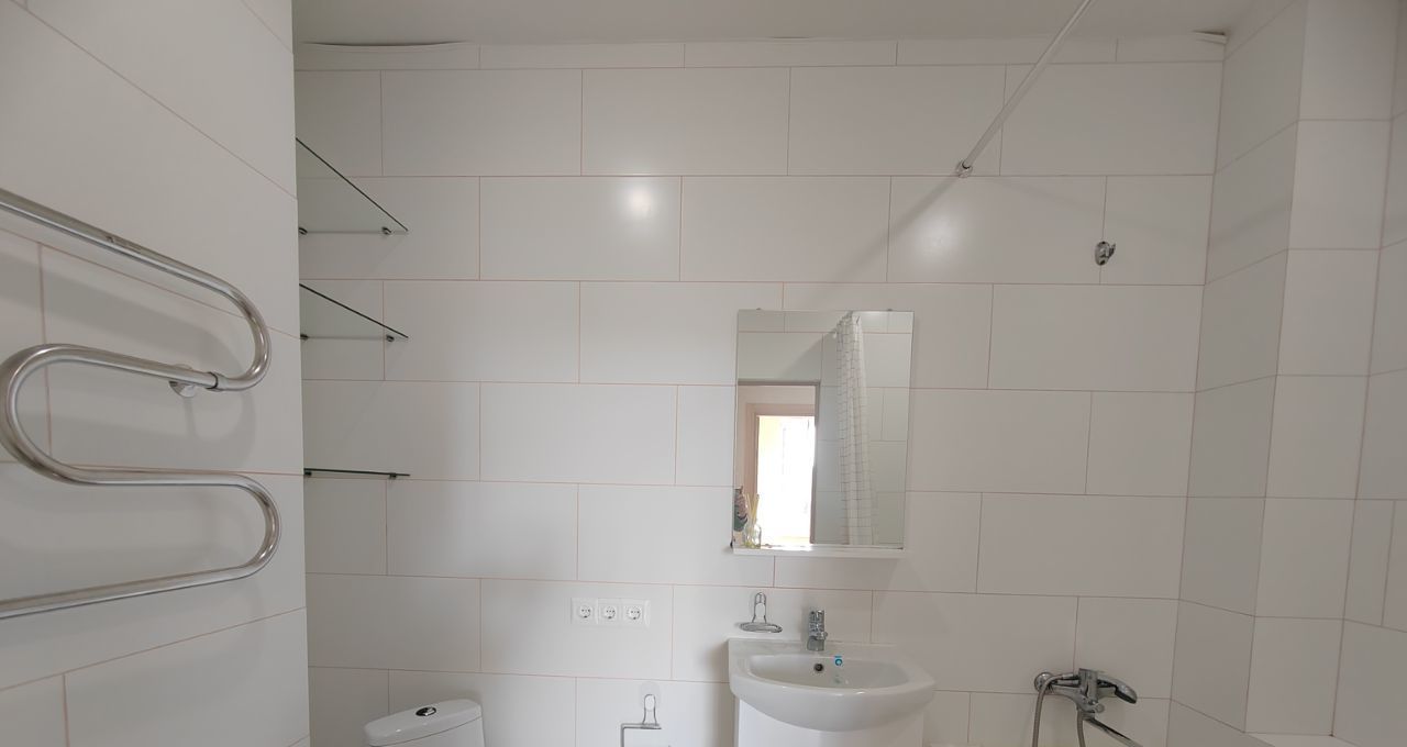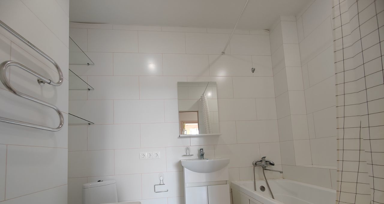 - в сан.узле полноценная белоснежна ванна, стиральная машина-автомат, электрический полотенцесушитель, унитаз, раковина с тумбой, много полочке для хранения бытовой химии.