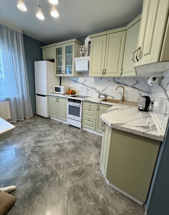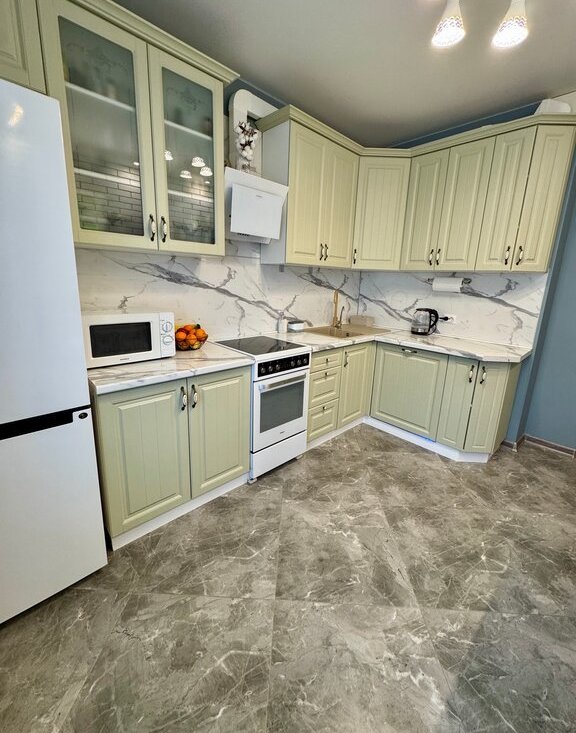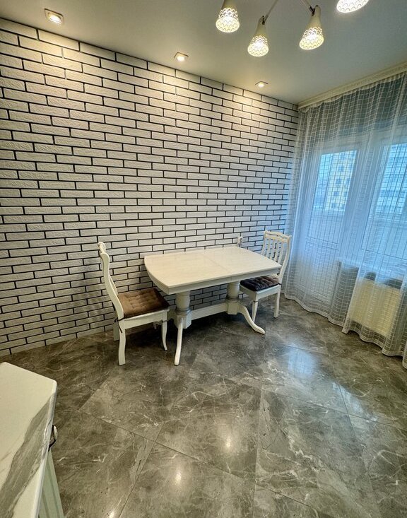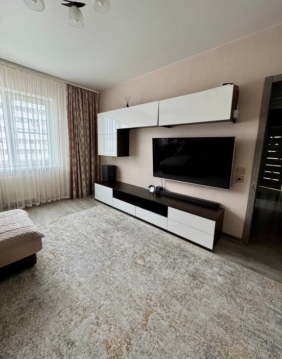 Квартира с продуманной планировкой и современным оснащением. Просторная кухня оборудована посудомоечной машиной. Санузел совмещенный, выполнен в современном стиле с качественной отделкой, установлена стиральная машина и предусмотрены удобные системы хранения. В гостиной — новый телевизор.