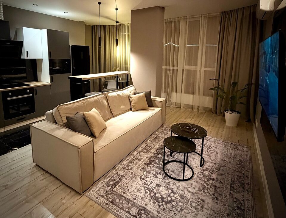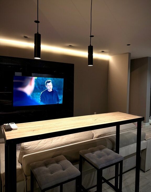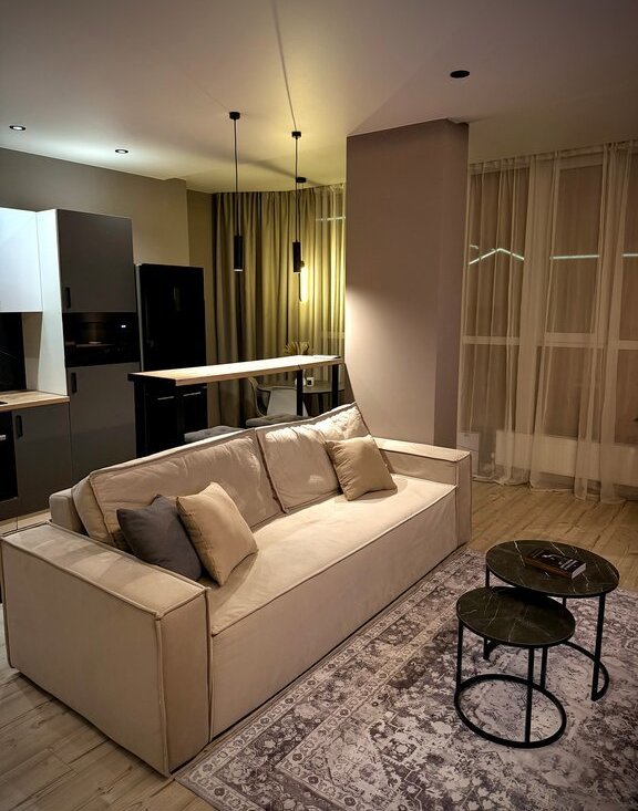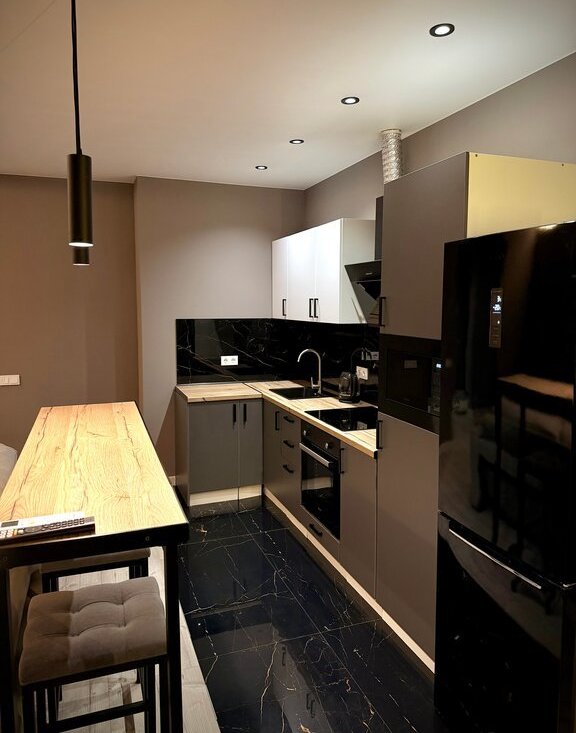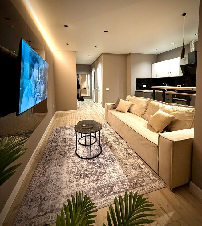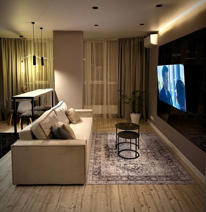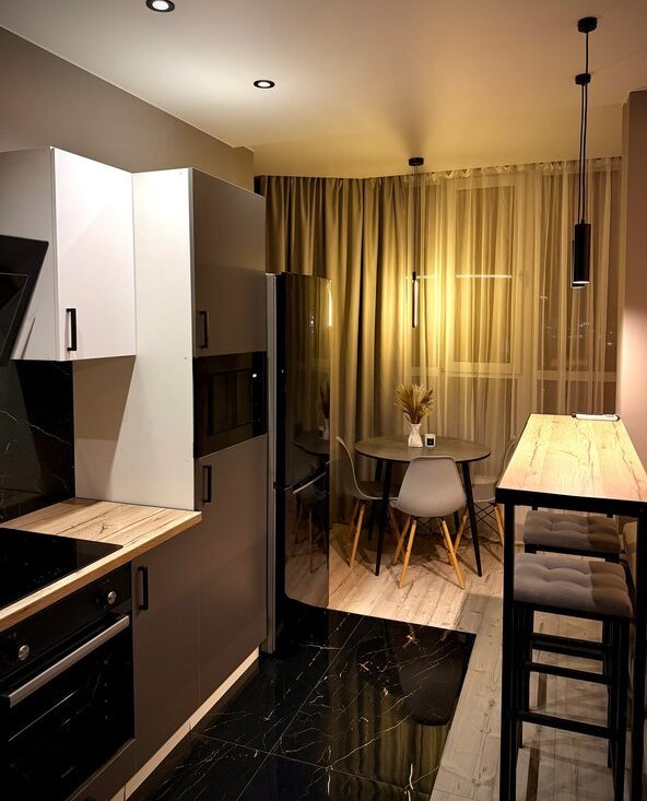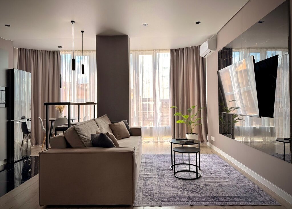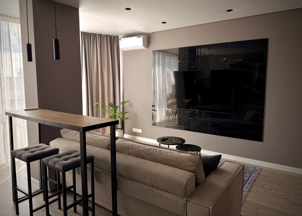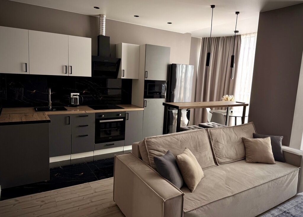 * Просторная кухня-гостиная (30 м2) с раскладывающимся диваном и телевизором 65 дюймов