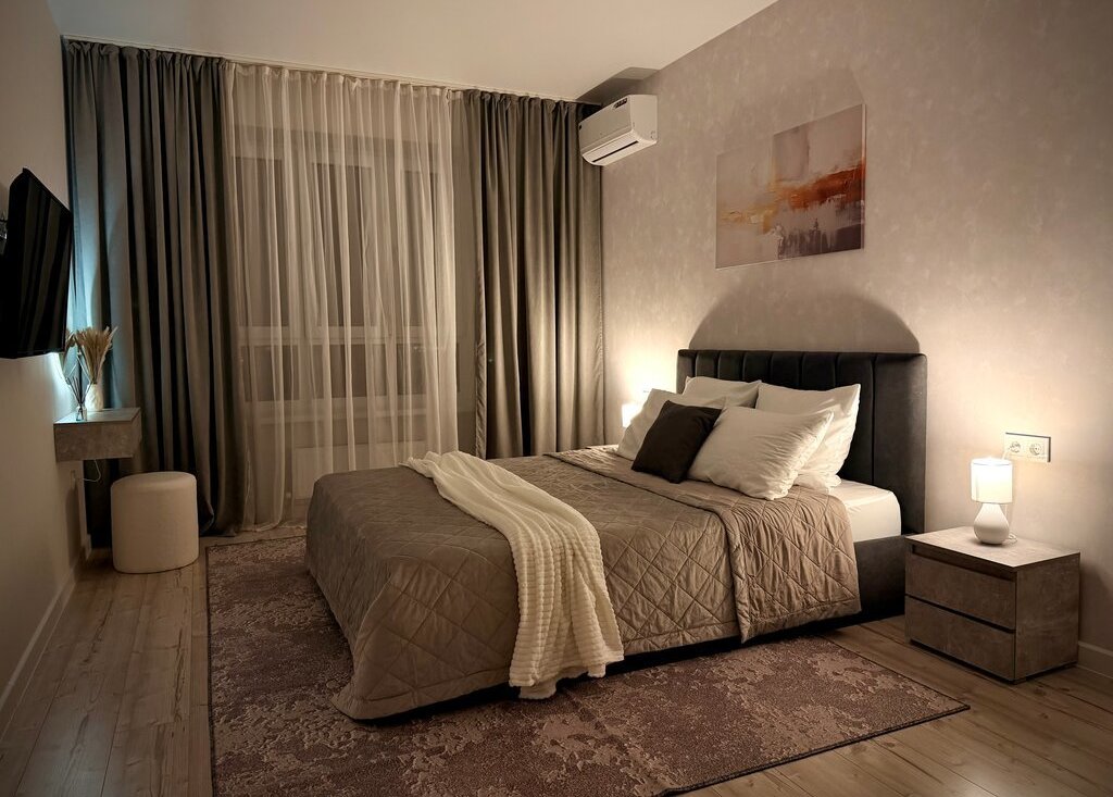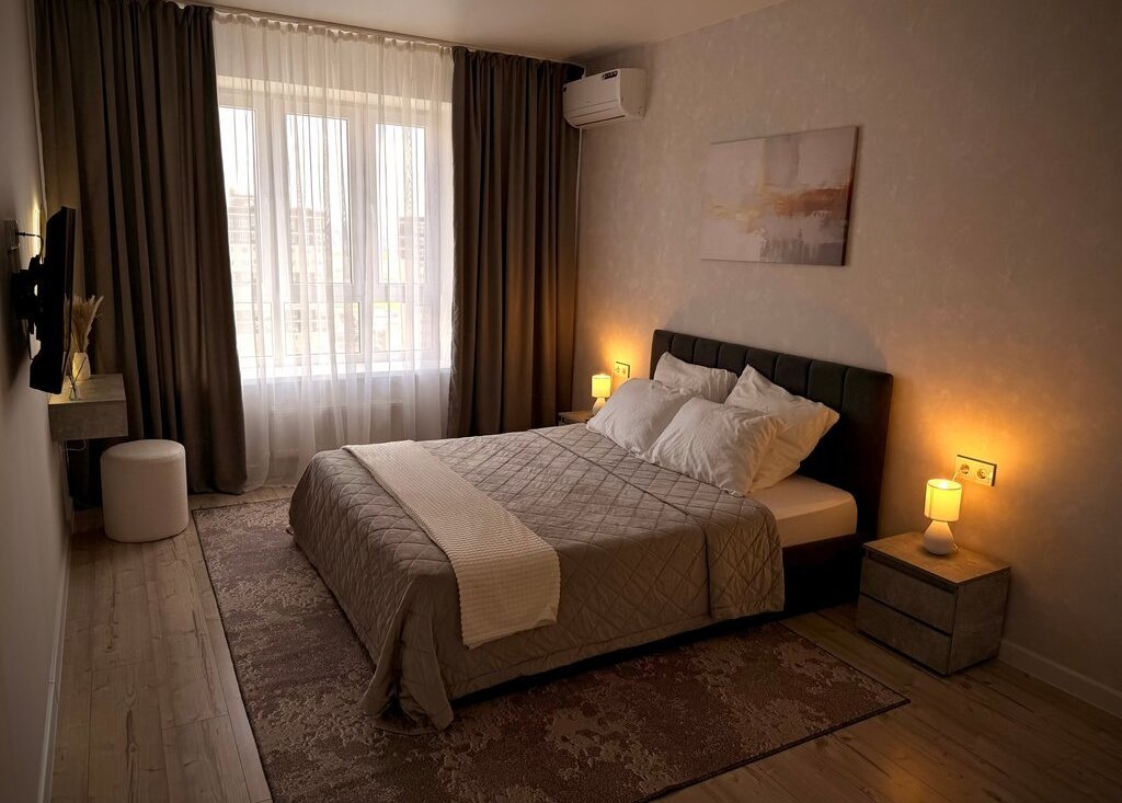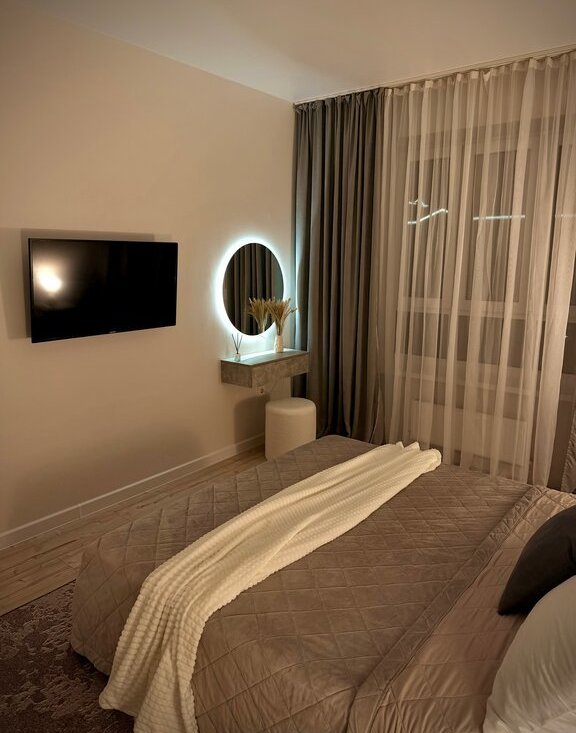 * Отдельная спальня (12 м2) с кроватью 160×200 и новым двухсторонним матрасом аскона и телевизором 40 дюймов