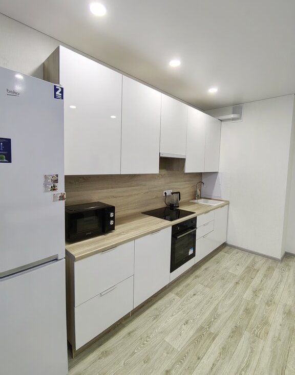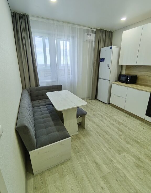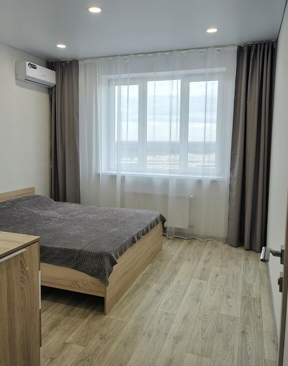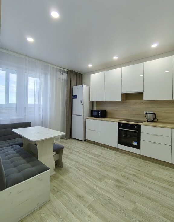 Хороший ремонт, есть вся необходимая мебель и техника (в том числе микроволновка, пылесос, утюг, гладильная доска, сушилка для белья). Квартира теплая, с удачным расположением окон - с видом на город, парковку, детский сад, школу, вечером - на закат.