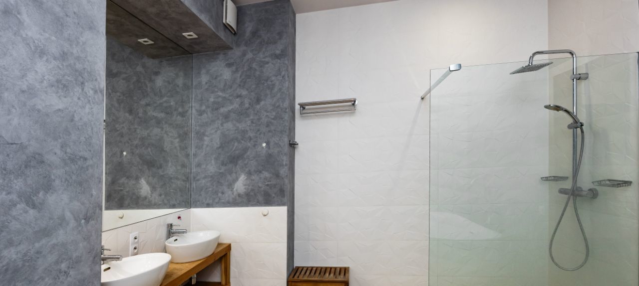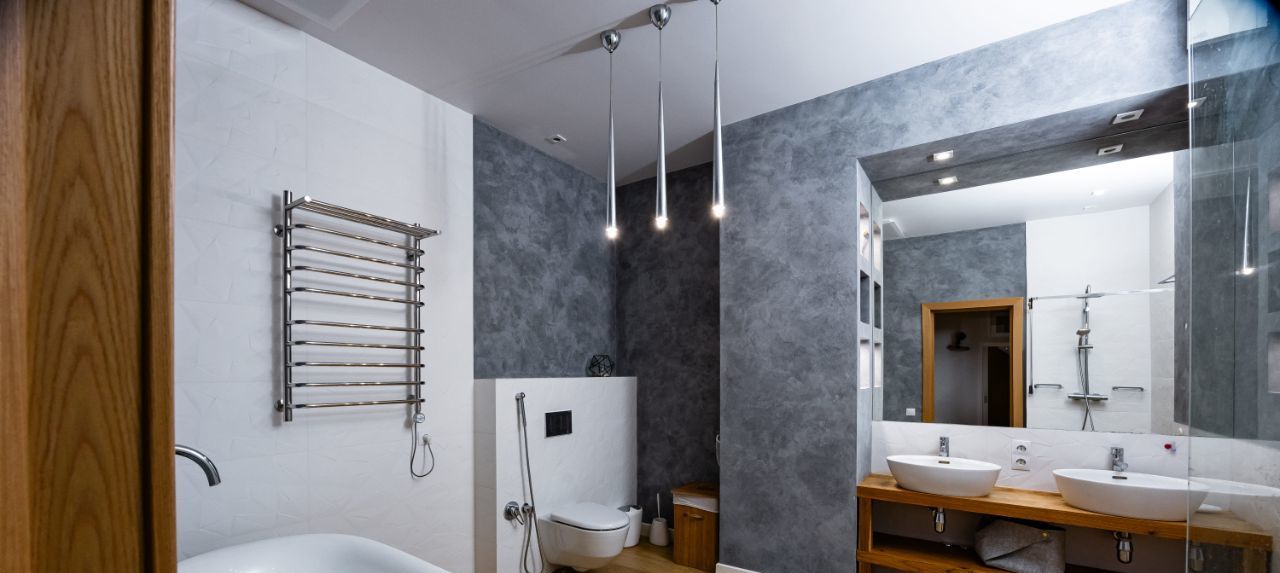 — большая ванная комната с душевой зоной, двумя раковинами и отдельно стоящей ванной