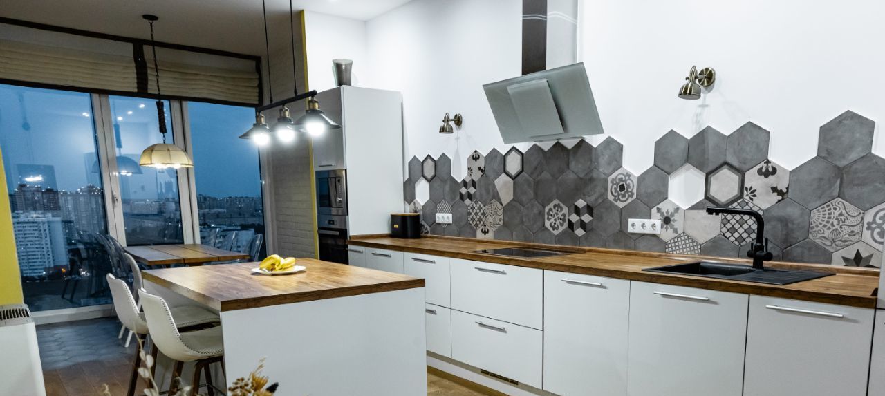 — кухня с мебелью, холодильником, индукционной плитой, духовкой, встроенной микроволновкой и посудомоечной машиной Bosсh. Обеденная зона с деревянным столом, панорамным остеклением и теплым полом