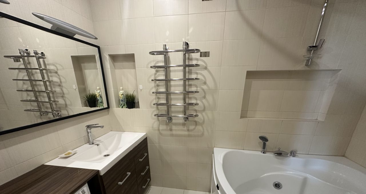 3-х комнатная квартира в кирпично-монолитном доме. 2 лифта. 16 этаж. Вид на 3 стороны города. Прихожая с большим встроенным шкафом. Гостиная и кухня совмещены. Длина кухонной стенки - 4,5 метра. Полностью оборудована спальная комната. Вместительный шкаф. В квартире есть все для жизни. 3 балкона (на кухне и в каждой комнате). 2 кондиционера. В ванной комнате джакузи. Во всей квартире натяжные потолки. Спокойные, дружелюбные соседи.