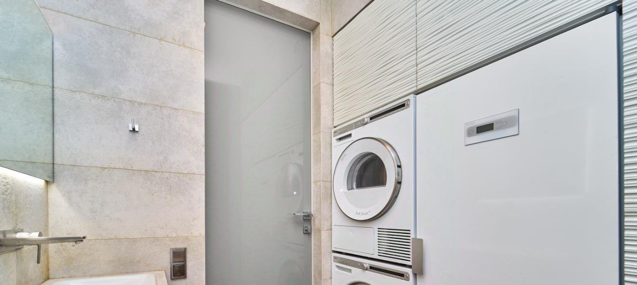 - Отдельная гостевая зона включает прихожую, дополнительный санузел-постирочную, гостиную, кухню, лоджию с панорамным остеклением и кладовую.