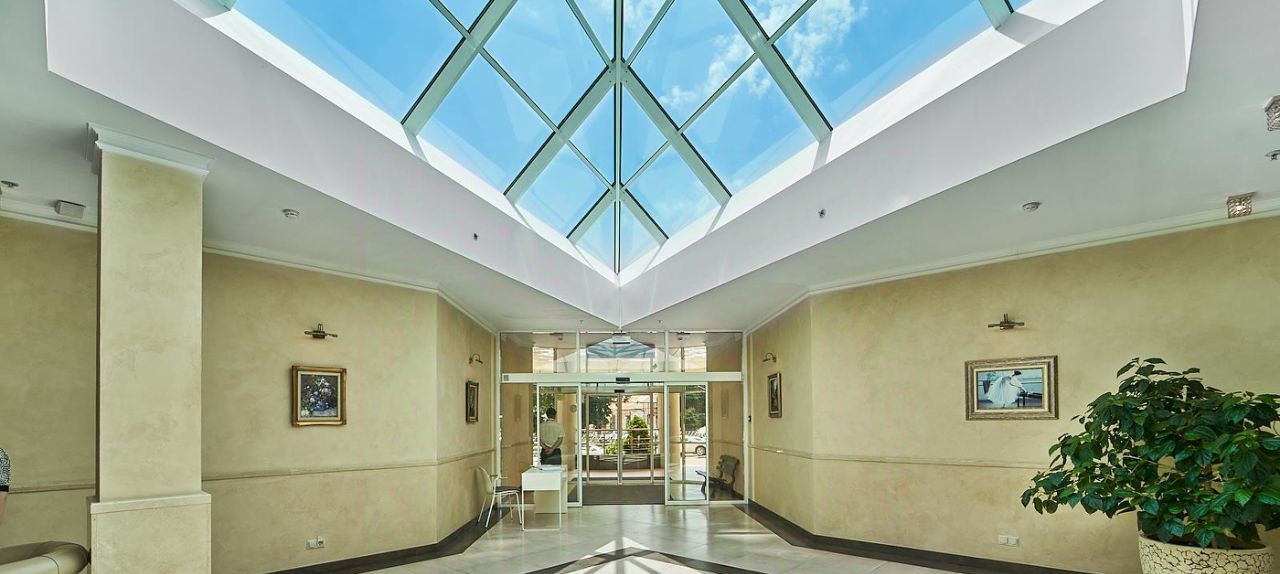 - Ресепшен гостиничного уровня — уютное фойе, зона с мягкой мебелью, отдельный санузел и зона для встреч или ожидания.