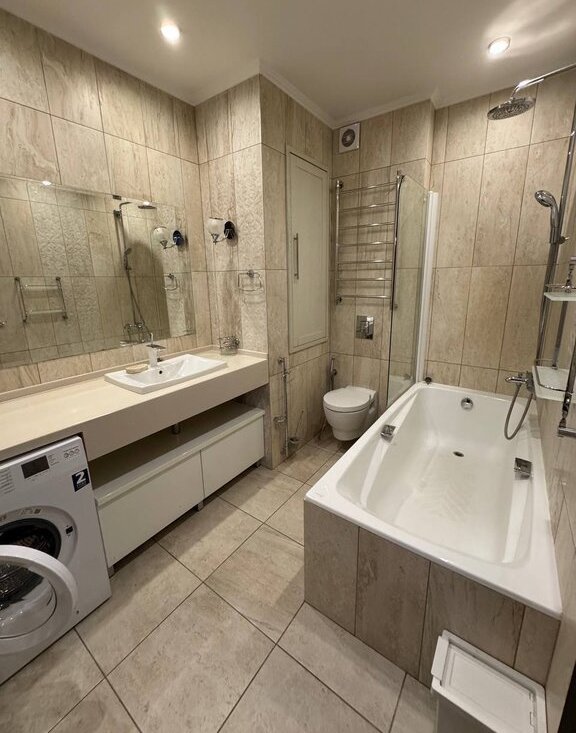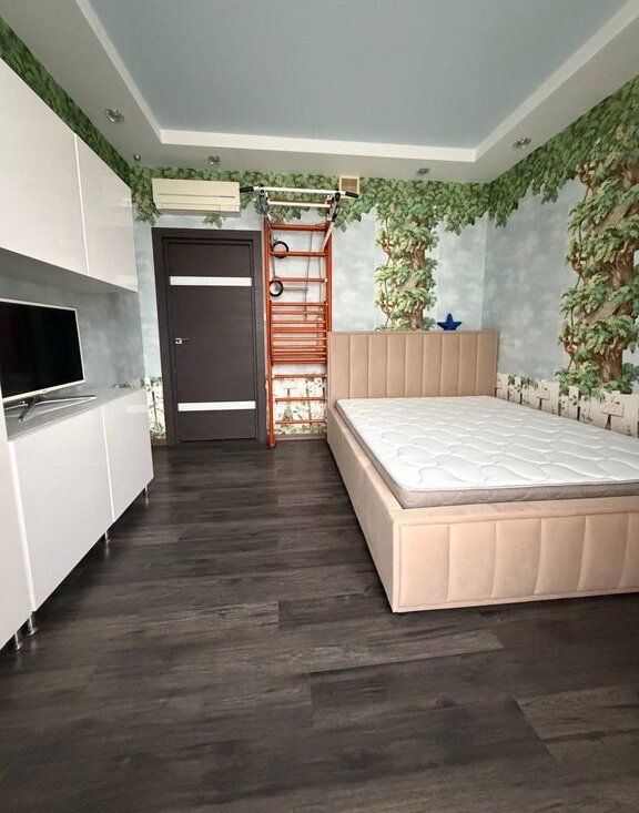 В квартире выполнен стильный дизайнерский ремонт с использованием качественных материалов. Интерьер продуман до мелочей: в комнатах и на кухне есть необходимая мебель. Техника в вашем распоряжении: кондиционер, холодильник, посудомоечная и стиральная машины, телевизор. Для вашего удобства предусмотрены две лоджии и один балкон.