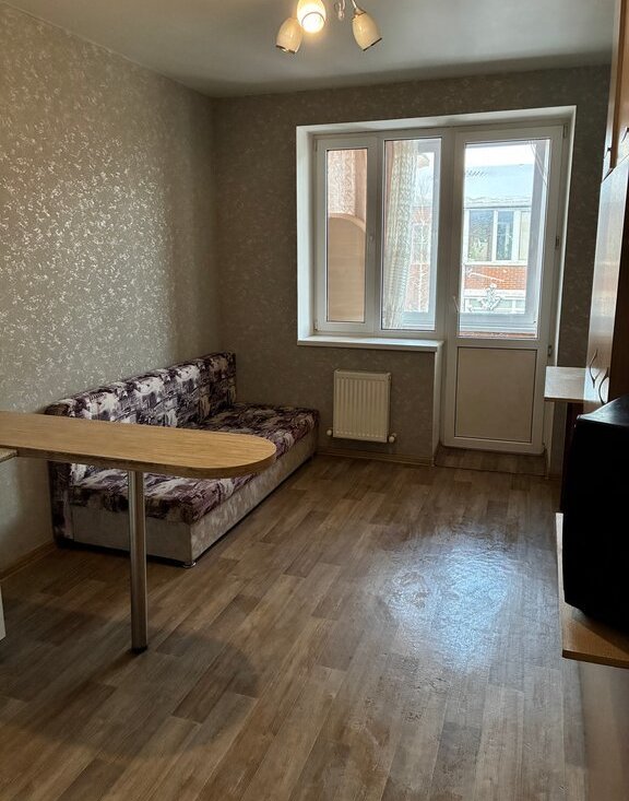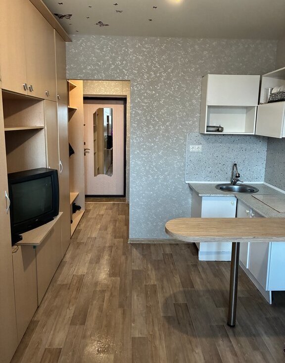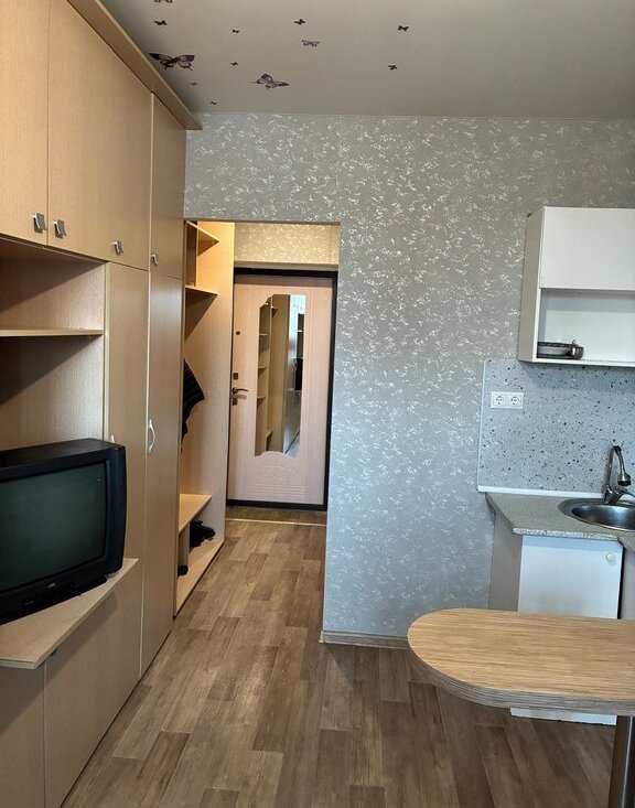 Сдается студия на длительный срок в монолитно-кирпичном доме 2016 года постройки. Дом расположен в тихом районе, что обеспечивает спокойствие и уют. В квартире выполнен косметический ремонт, стены отделаны светлыми обоями, полы покрыты линолеумом . Из мебели имеются шкафы и диван, а также телевизор.
