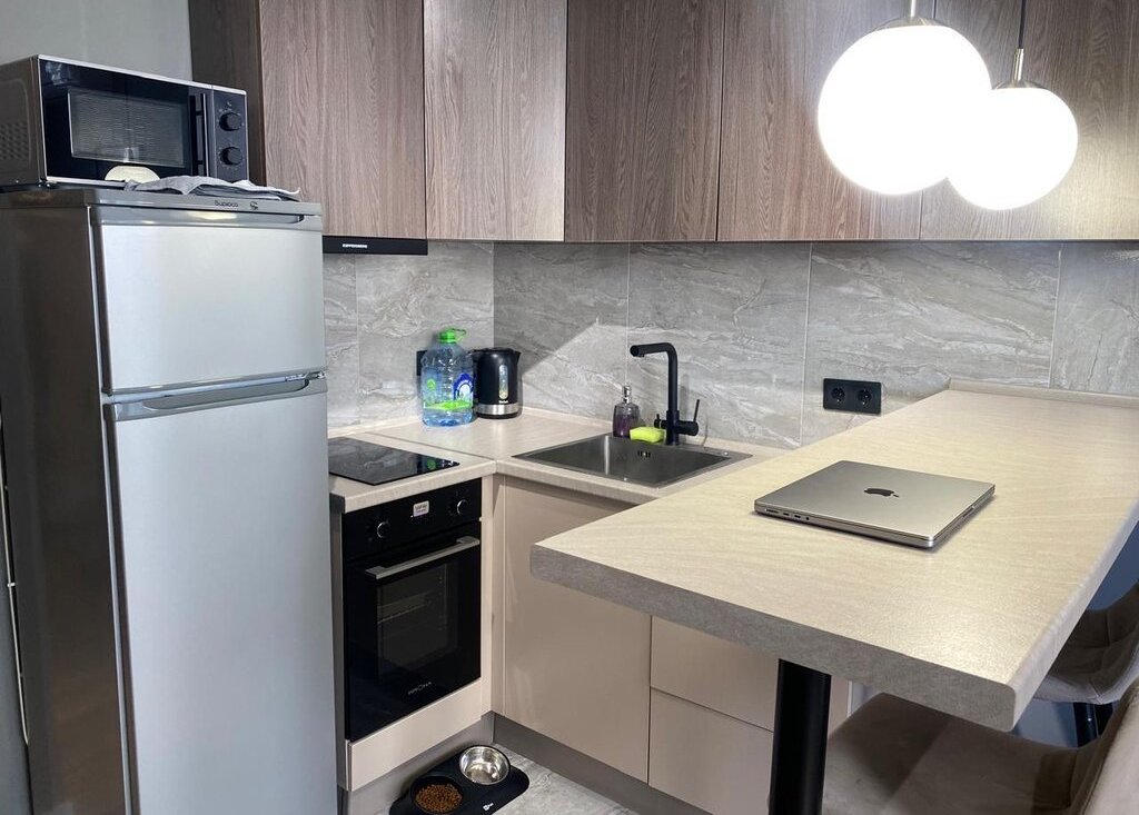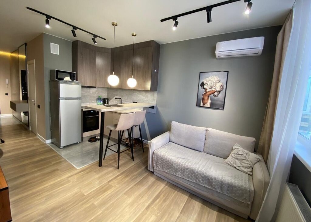 Внутри вас ждёт современная кухня с необходимой бытовой техникой: холодильник, плита и микроволновая печь. В комнате установлен кондиционер и телевизор, а также удобный диван и шкафы.