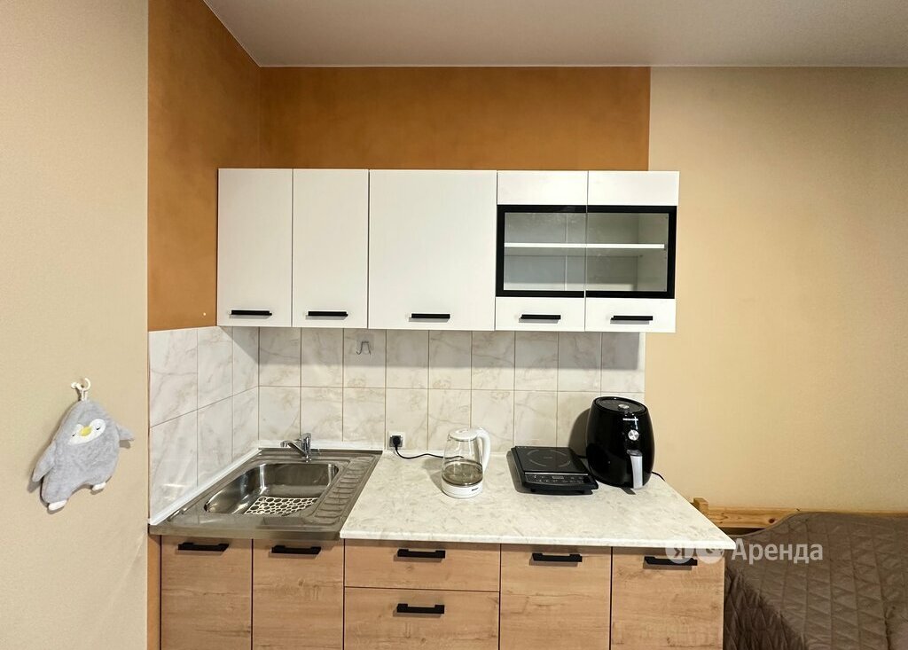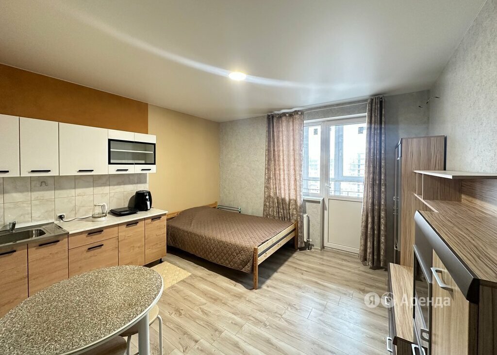 Студия расположена на видовом 22 этаже. Из техники есть: холодильник, электрическая варочная панель, аэрогриль, электрический чайник, стиральная машина, пылесос.