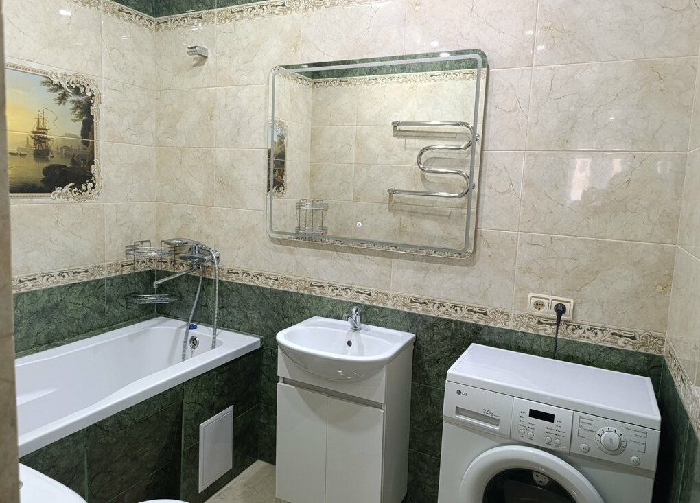 Санузел совмещенный, оформлен плиткой, оснащен ванной и стиральной машиной. Лоджия застеклена, что позволяет использовать ее как дополнительное пространство. В доме есть пассажирский лифт, а во дворе предусмотрена открытая парковка.