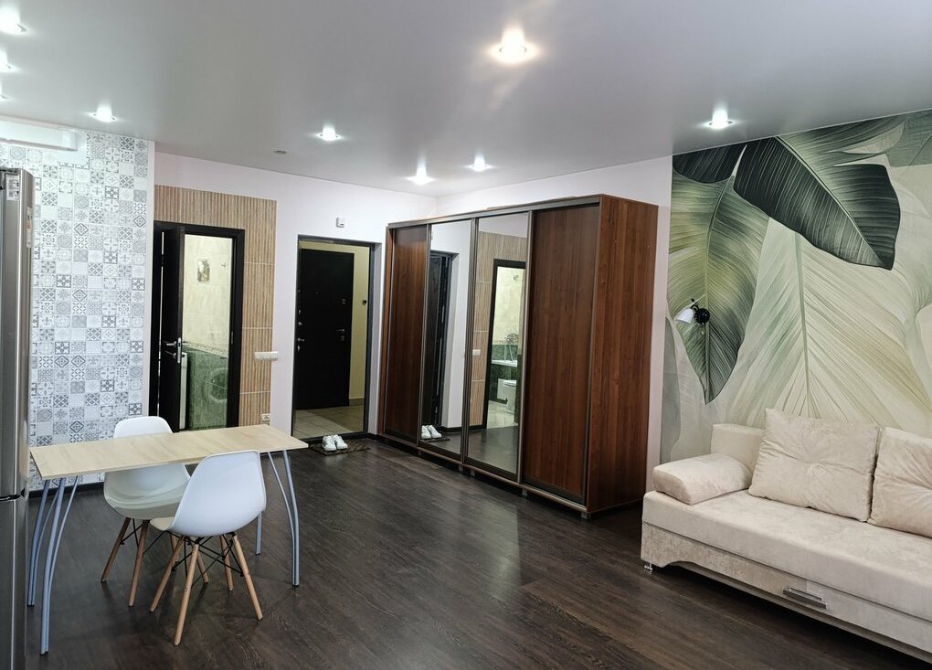 Сдается уютная студия с современным ремонтом на втором этаже кирпичного дома. В квартире выполнен евро ремонт.Просторная кухня оборудована всем необходимым: холодильник, плита, вытяжка и обеденный стол. Из мебели — вместительные шкафы и удобный диван.