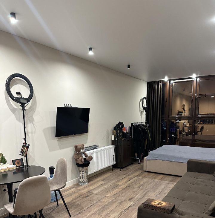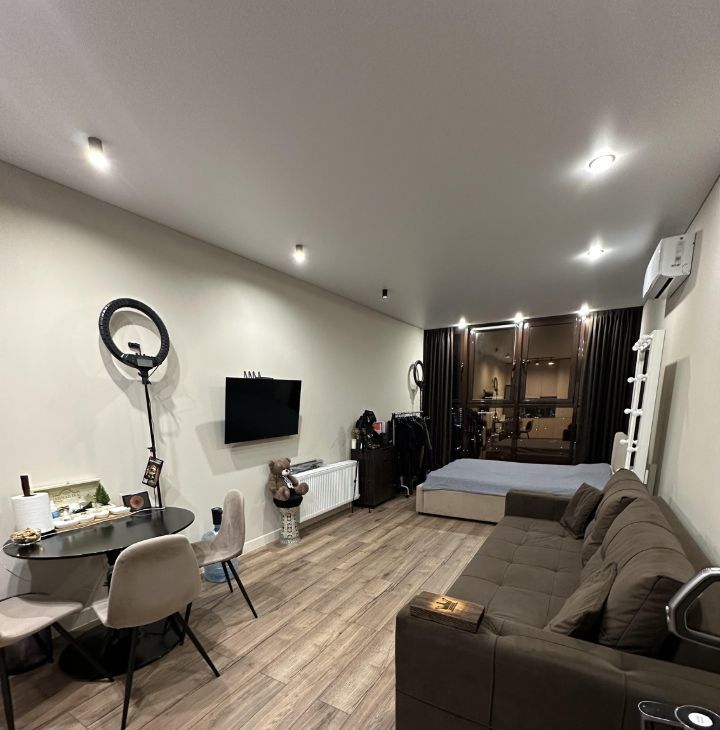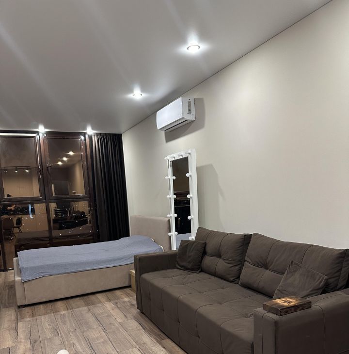 Продается стильная студия с дизайнерским ремонтом на 24 этаже монолитно-кирпичного дома. Из окон открывается потрясающий вид на город. В квартире установлены современные панорамные окна, которые наполняют пространство естественным светом.