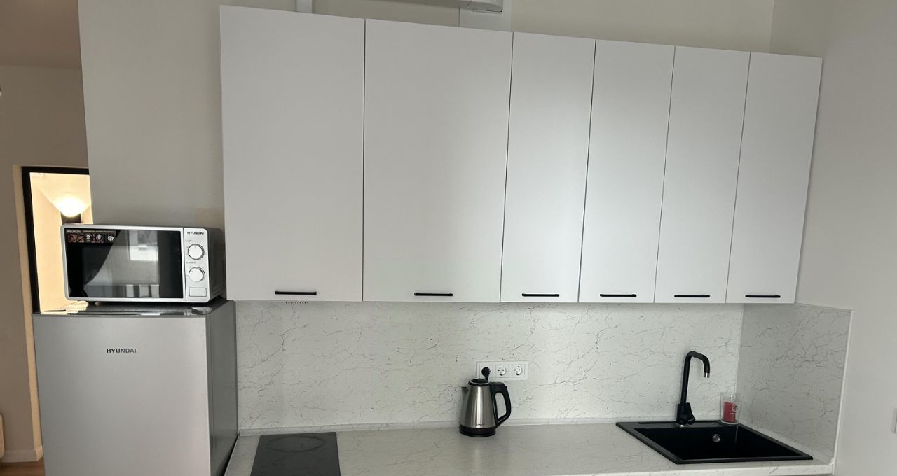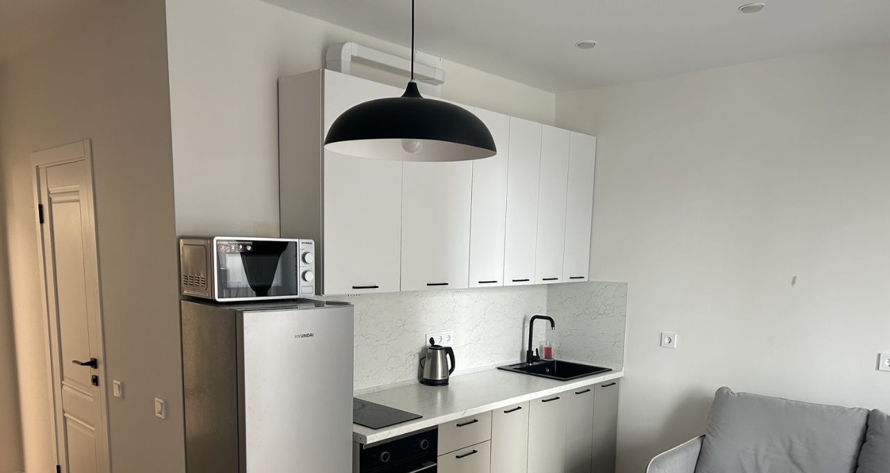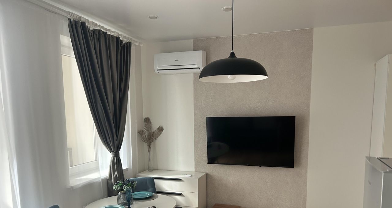 В квартире сделан качественный евроремонт. Пространство студии грамотно спланировано: жилая зона 18 кв. м объединена с кухней площадью 10 кв. м, что создаёт уютную атмосферу для жизни. На кухне есть вся необходимая мебель и техника: холодильник, посудомоечная машина, кондиционер, телевизор и стиральная машина. Ванная комната оборудована ванной. В квартире также есть лоджия, где можно наслаждаться свежим воздухом.