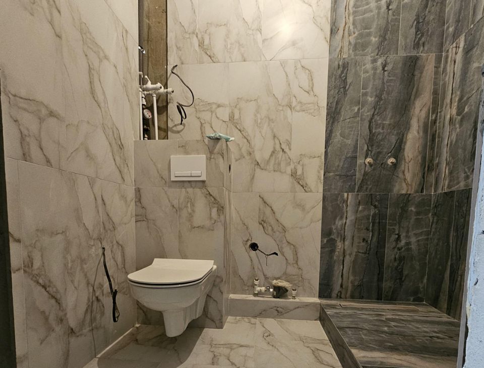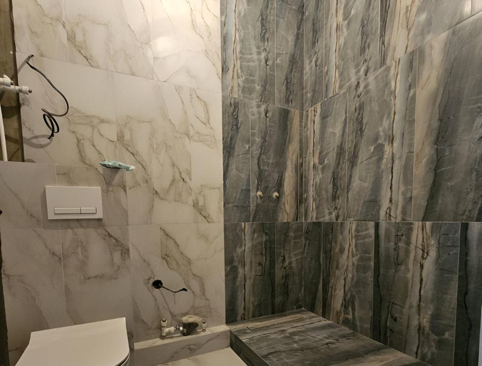 на стенах керамогранит 120 на 60, сделаны выходы под бойлер.