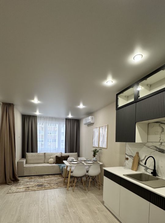 Продается уютная студия с евроремонтом в современном доме 2021 года постройки. Квартира находится на 3 этаже 21-этажного дома. Общая площадь составляет 44,3 кв. м, жилая — 30 кв. м, а просторная кухня занимает 13 кв. м. Высота потолков 2,7 метра создает ощущение простора. Окна выходят во двор, обеспечивая тишину и уединение.