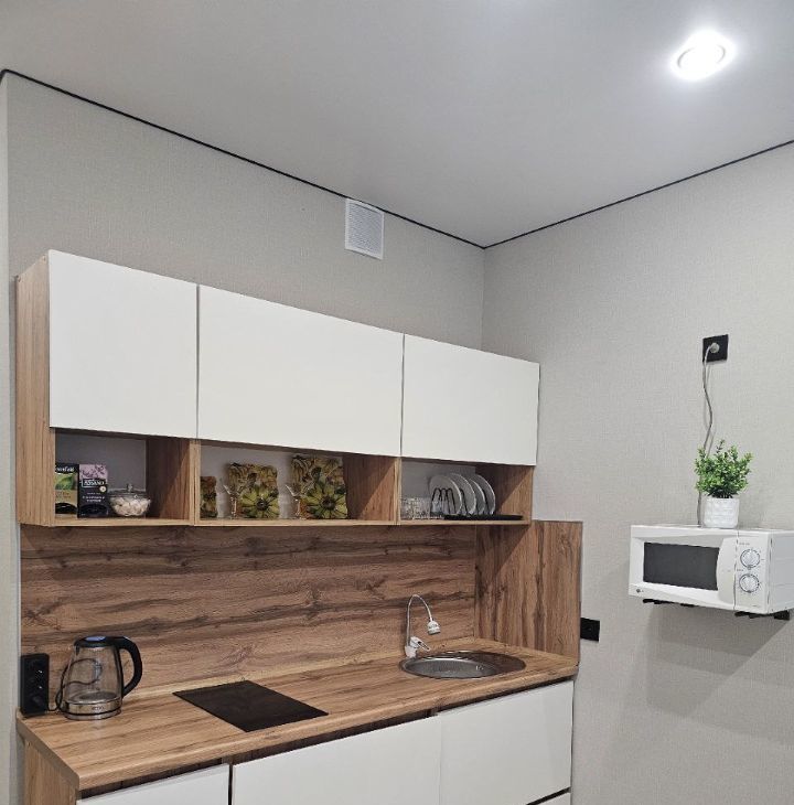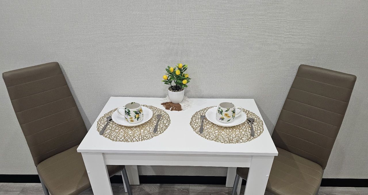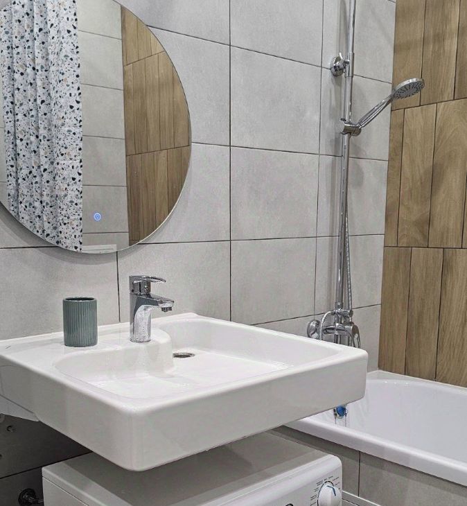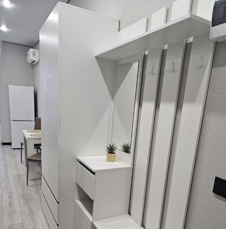 Квартира оформлена с дизайнерским ремонтом и полностью готова к проживанию. В студии есть все необходимое: кондиционер, холодильник, телевизор и стиральная машина. Для удобства жильцов предусмотрена ванна. Кухня и жилая зона обставлены современной мебелью, что создает атмосферу уюта и функциональности.