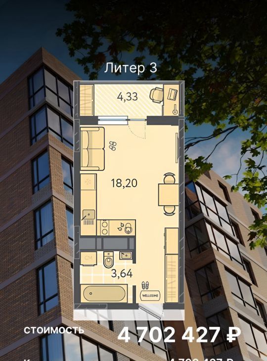 Студия Краснодарский край, Краснодар ул. Имени Героя Дангириева, 4к1 (26.0 м²)