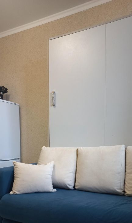 в квартире есть все необходимое для проживания: стиральная машинка, холодильник, телевизор, удобный кровать-диван-трансформер, кухонный гарнитур, столовая зона и раскладной диван.