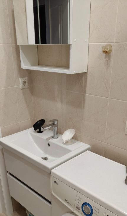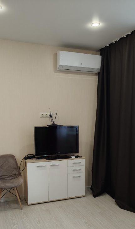 В квартире сделан дизайнерский ремонт, поэтому она готова к комфортному проживанию. Пространство студии обустроено с учётом современных трендов: в наличии вся необходимая мебель на кухне и в комнате. Из техники есть кондиционер, холодильник, телевизор и стиральная машина. Ванная комната оборудована душевой кабиной и совмещена с санузлом. Также в квартире имеется лоджия для отдыха.