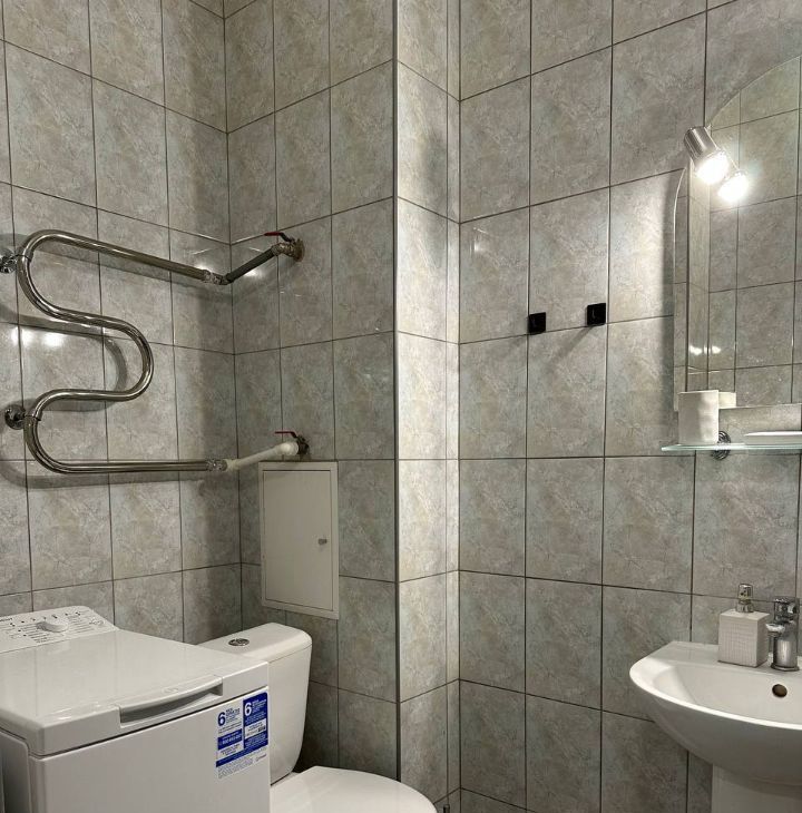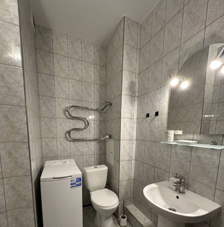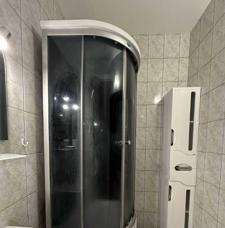 Санузел совмещенный, оборудован современной душевой кабиной и стиральной машиной ( теплый пол в санузле тоже установлен)